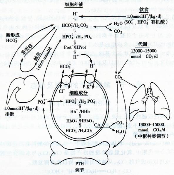 CO2和 H2O结合为H2CO3的可逆反应可以自发进行,但在碳酸酐酶( carbonic anhydrase, CA)的催化作用下反应进行更迅速。CA主要存在于肾小管上皮细胞、红细胞、肺泡上皮细胞及胃黏膜上皮细胞等细胞中。静息状态下正常成人每天可产生300~400L CO2,如果这些CO2全部与 H2O结合生成H2CO3,可释出15mol左右 H+,成为体内酸性物质的主要来源。通常将肺对H2CO3(CO2)排出量的调节,称为酸碱平衡的呼吸性调节。