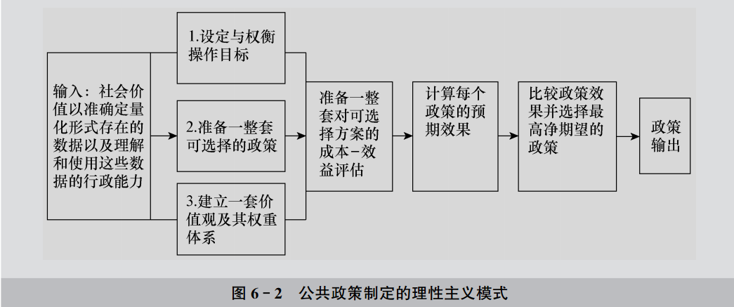 理性主义一直致力于理解当下社会中所有被接受的各种价值并赋予每一种价值一个相对的权重,然后发现所有可选择的政策方案,考查每一个政策选择方案的所有后果,并且计算各个选定的方案在机会成本方面对其余备选方案可能的影响,以便在最后选择一个在社会价值成本-收益的比较中最具效能的决策方案。(客观理性与有限理性)