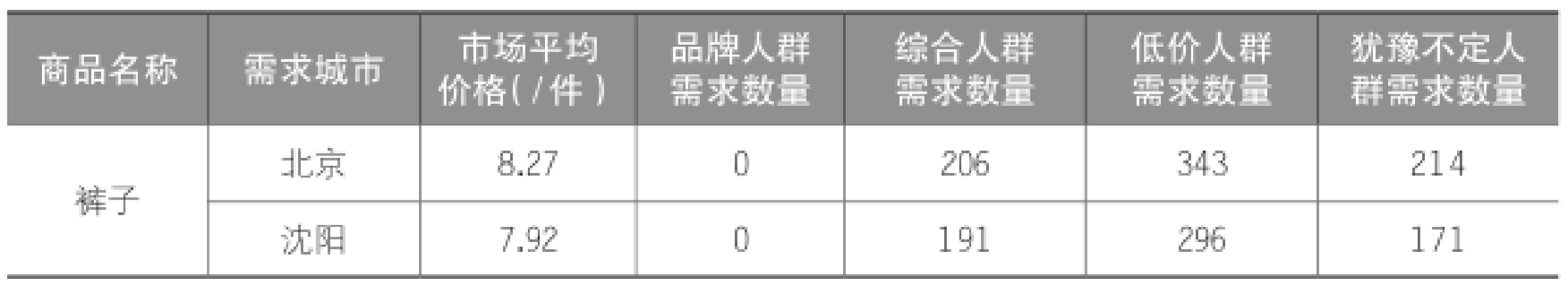 ③裤子的平均市场价格下降幅度较大,在北京市的场需求数量下降明显,而沈阳市场需求增加。