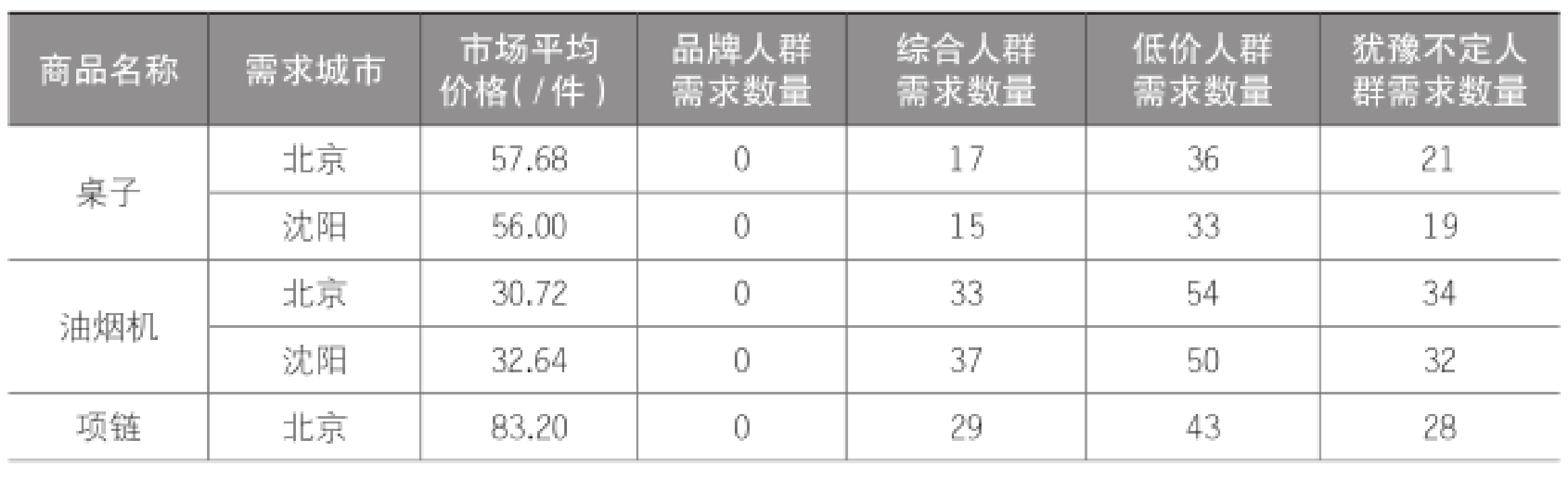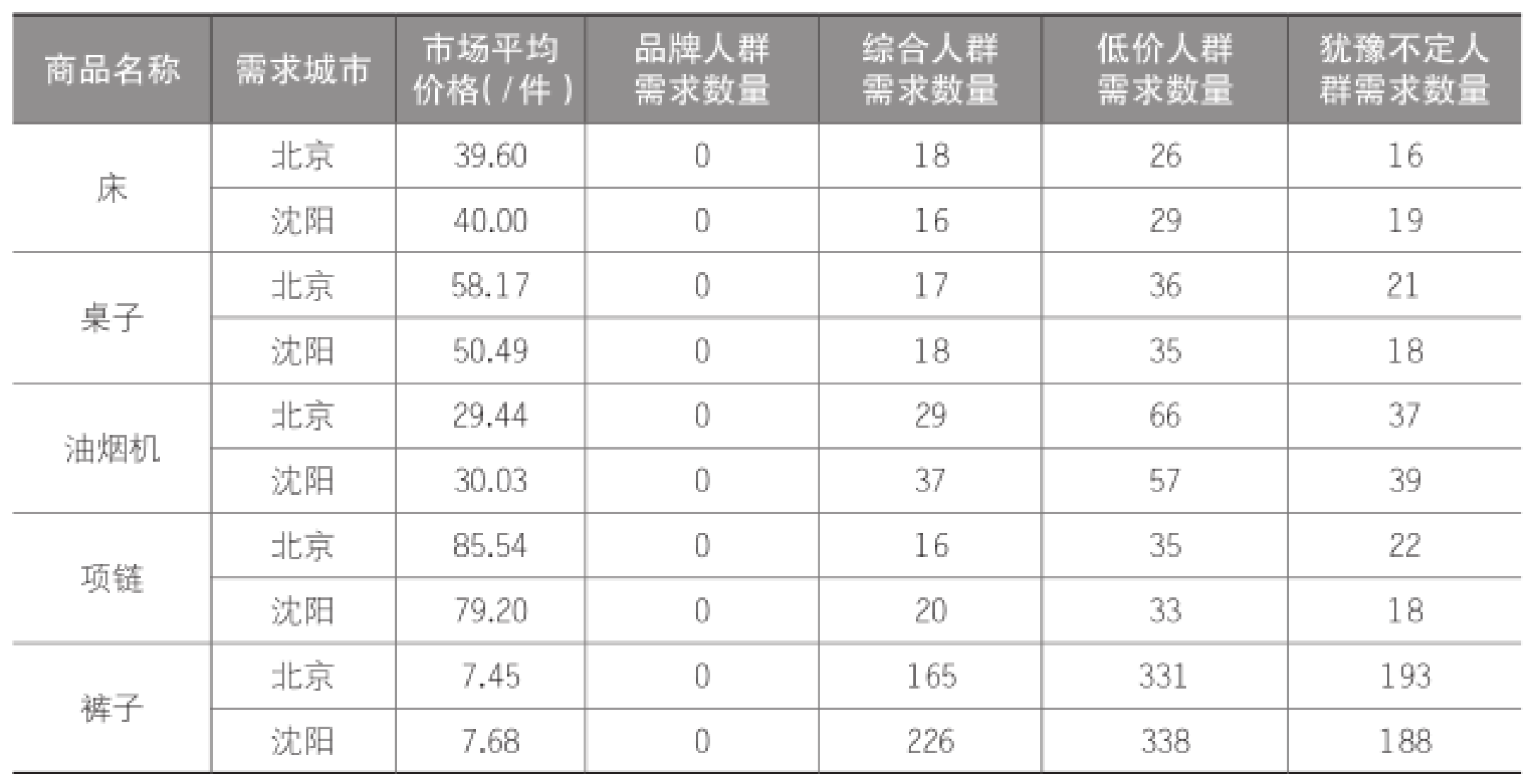 ITMC电子商务沙盘中的数据魔方为卖家提供了商品在不同城市不同人群的市场平均价格和需求数量。例如,第一轮第一期市场共有四种商品:桌子、油烟机、项链和裤子,这四种商品的需求主要集中在北京、沈阳两个城市,第一轮第一期品牌人群需求数量都为0,需求集中在综合人群、低价人群和犹豫不定人群,在运营时只需要考虑这三种人群的特点即可。