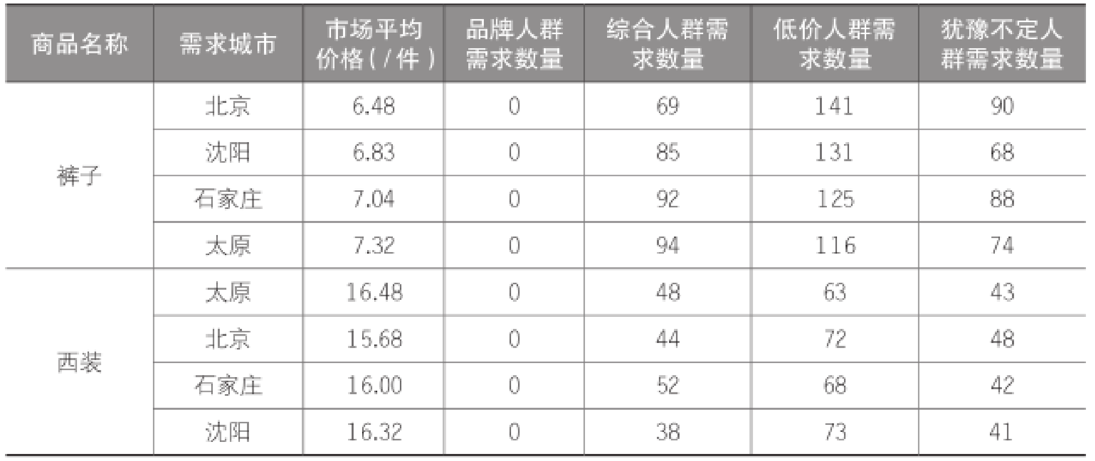 ① 本期新增商品西装,需求城市有北京、沈阳、石家庄、太原。