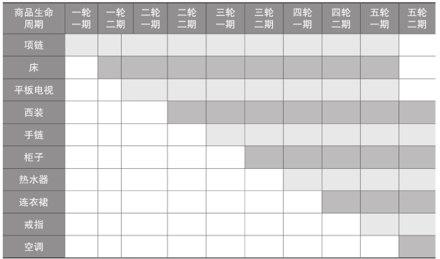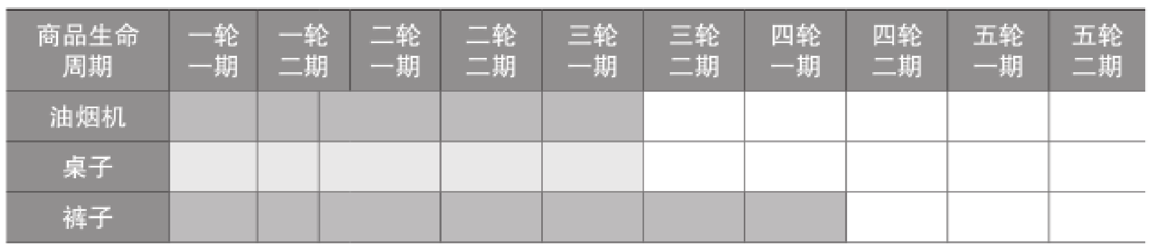 在ITMC电子商务沙盘中,各模拟企业需要经营五轮十期,随着时间的推移,系统共会出现13种商品,商品进入市场后,它的销量和利润都会随着时间的推移而改变,呈现出一个由少到多再到少的过程;随着时间推移,有的商品进入衰退期,逐渐退出市场,有的商品进入成长期进入市场,表2-19所示是对ITMC电子商务沙盘中所涉及的13种商品的生命周期进行的汇总,模拟企业可以据此制订经营计划。