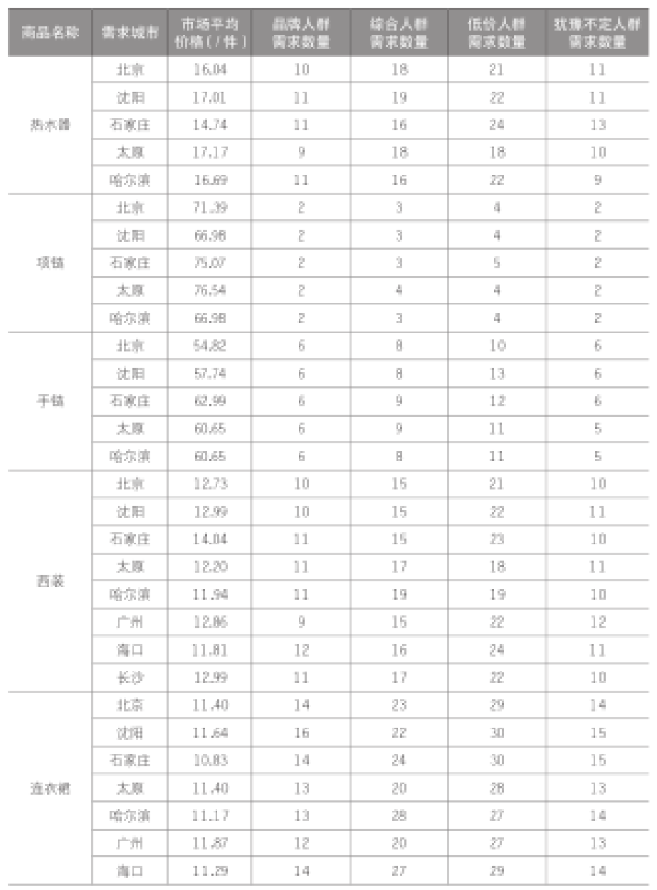 ⑤项链新增需求市场哈尔滨,市场平均价格整体下降,市场总需求数量明显减少。