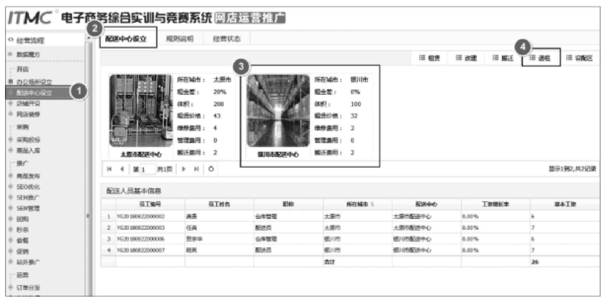 配送中心设立的位置与数量需要考虑商品需求人群所在地、物流成本进行决策。模拟企业可根据市场需求及不同城市的租金差、物流费用、工资差、是否支持邮寄等信息选择合适的城市设立配送中心,并设置配送区域。