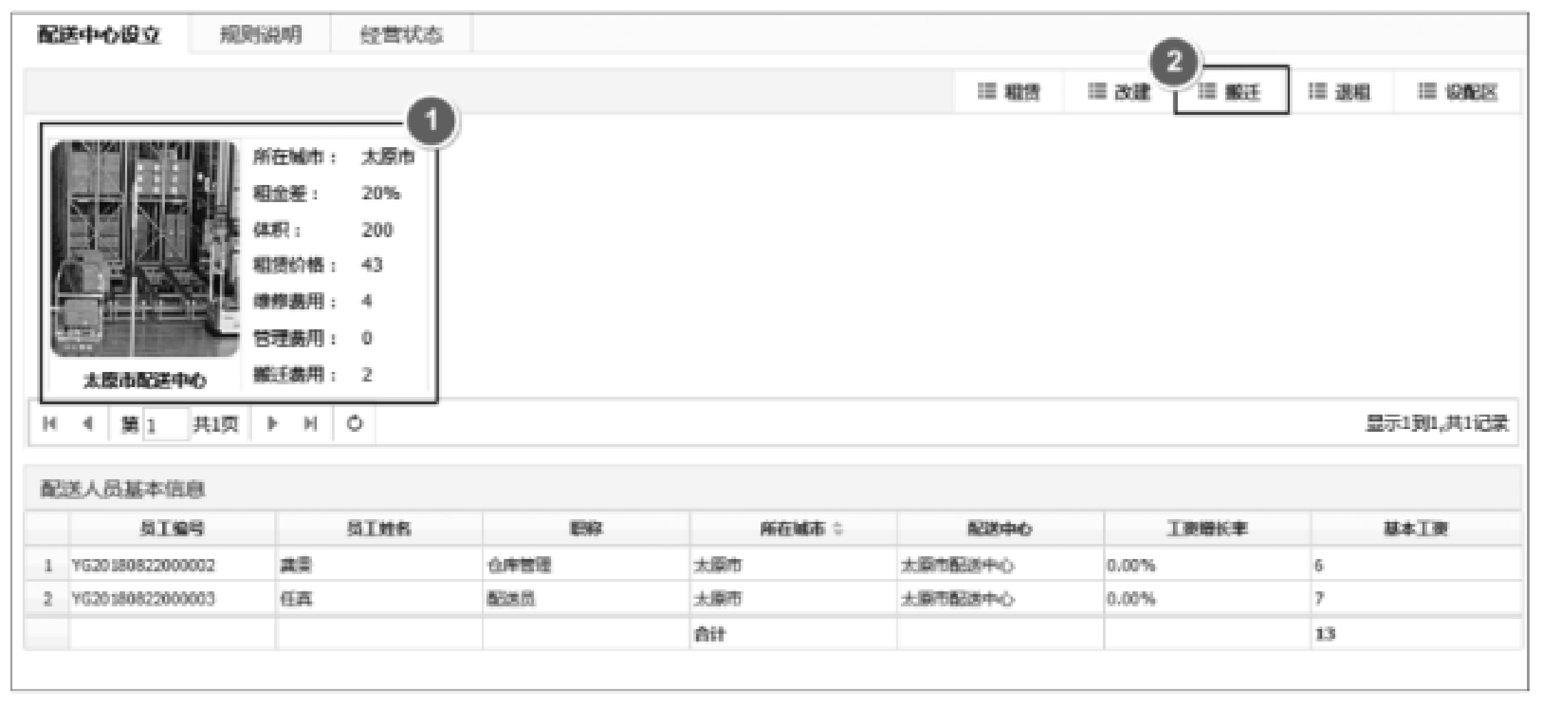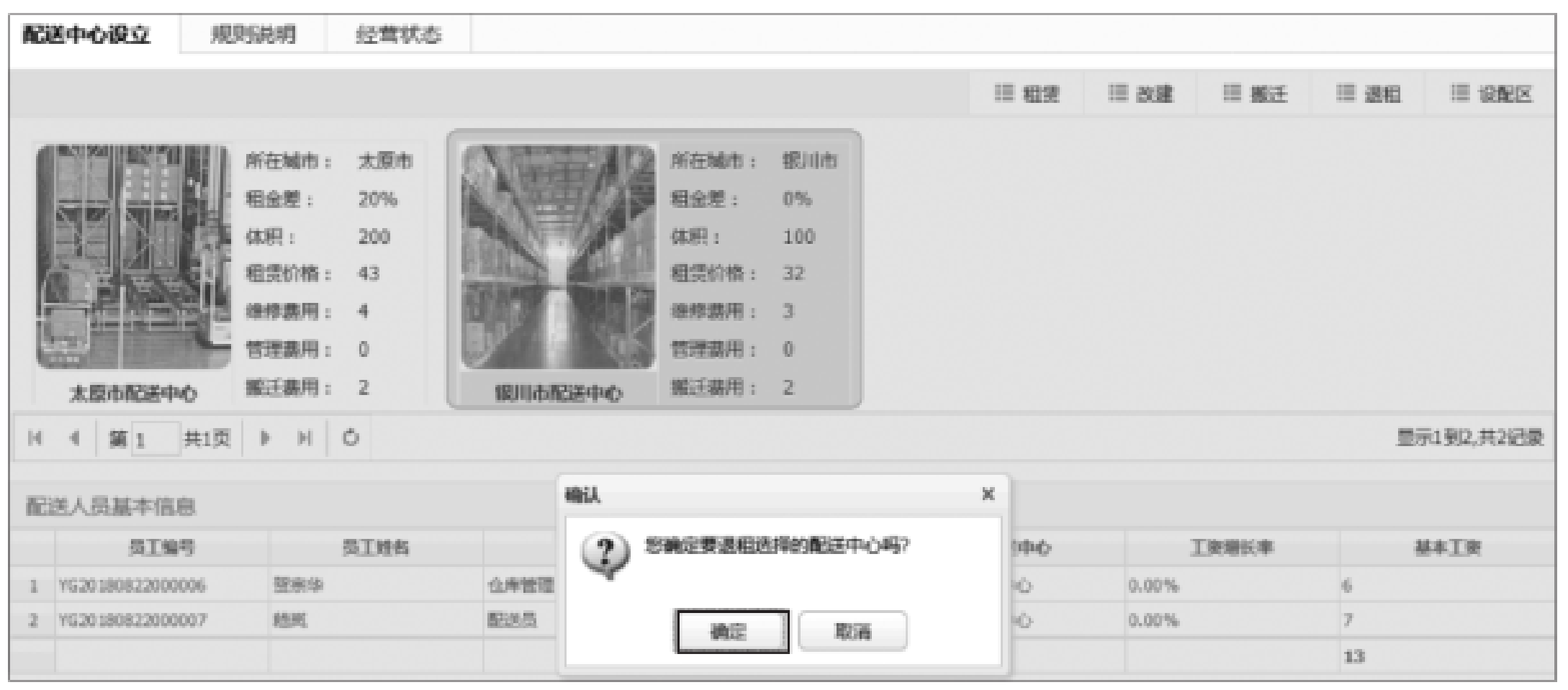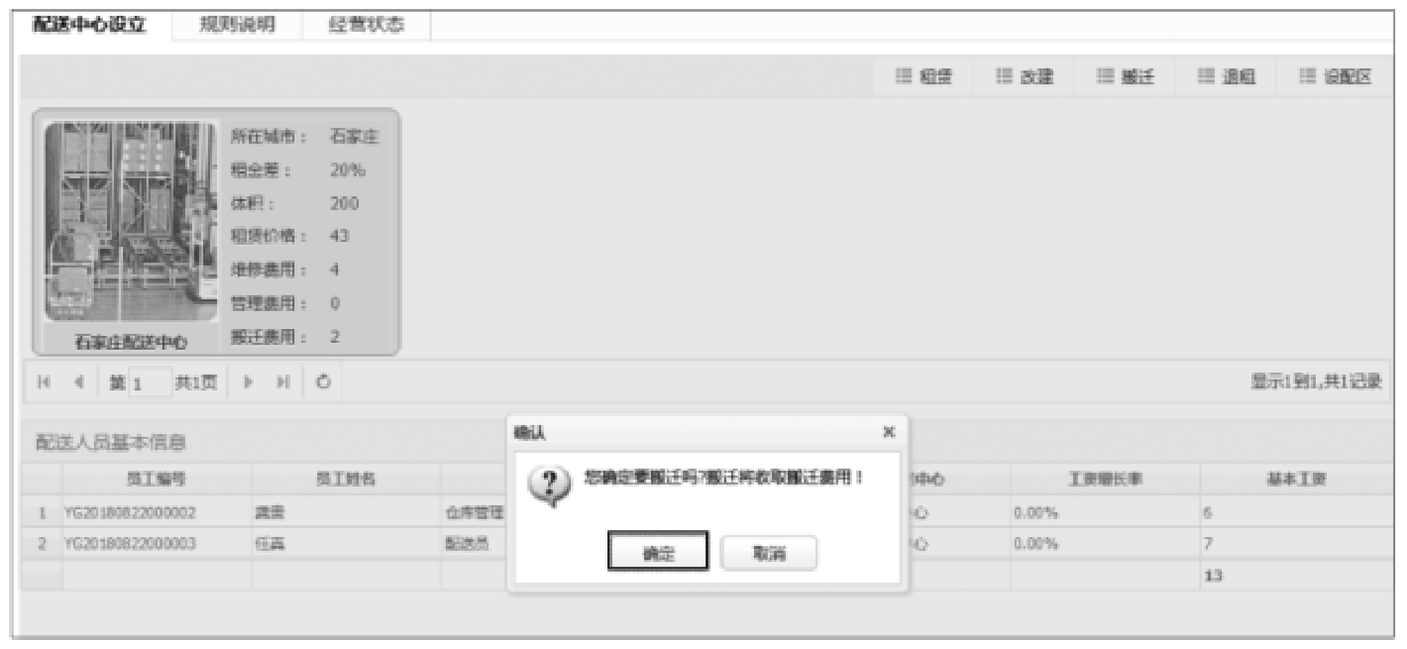 ① 租赁:一家模拟企业可租赁多个配送中心,但每个城市只能租赁一个配送中心。一旦建好一个配送中心,系统会自动创建两名员工,即一名仓库管理,基本工资为6,一名配送员,基本工资为7。