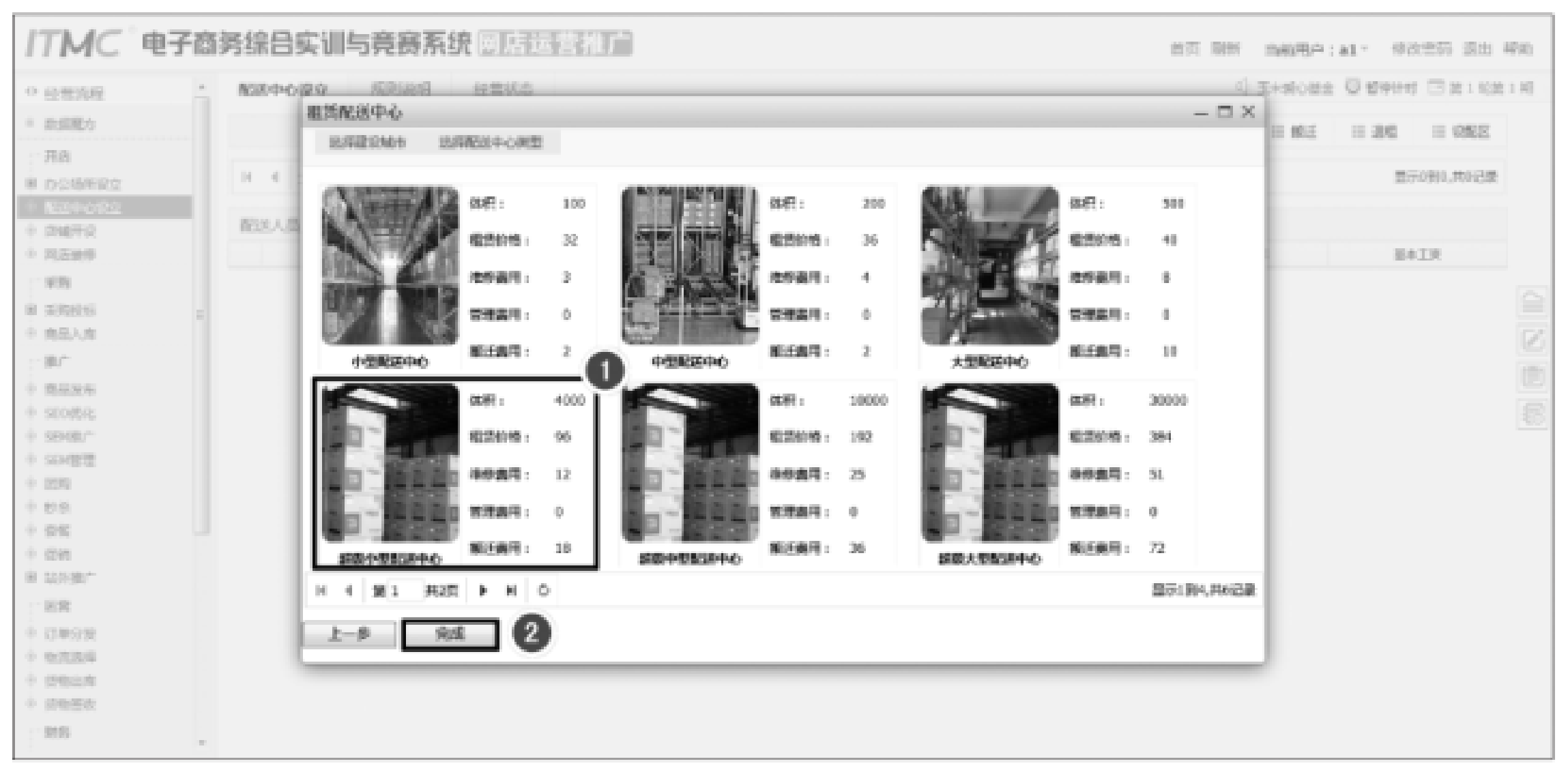 ④ 在出现的配送中心类型中单击选择其中一个,被选中的配送中心颜色加深,单击“完成”按钮,如图3-6所示;