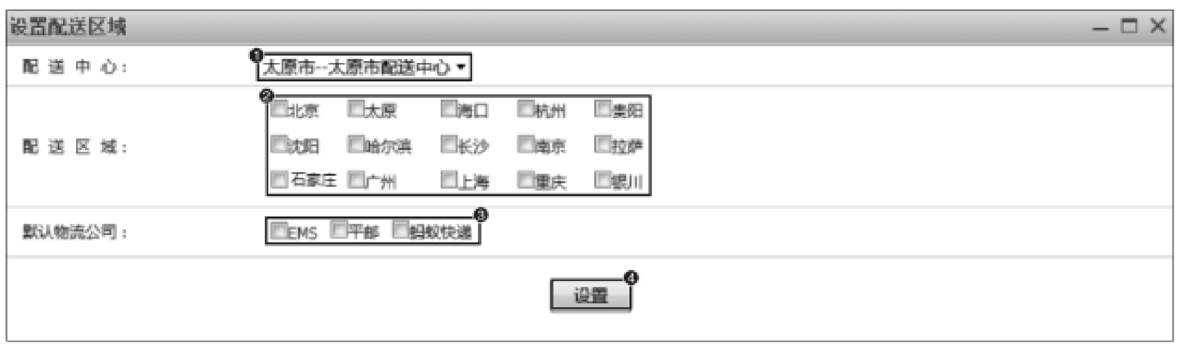 ③ 在出现的“设置配送区域”窗口,可进行“配送中心”“配送区域”和“默认物流公司”的选择,选择好后,单击“设置”按钮,如图3-18所示。