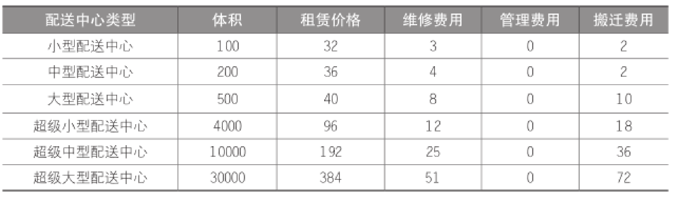 配送中心的类型包括小型配送中心、中型配送中心、大型配送中心、超级小型配送中心、超级中型配送中心和超级大型配送中心这六种。各配送中心具体的参数见表3-3。