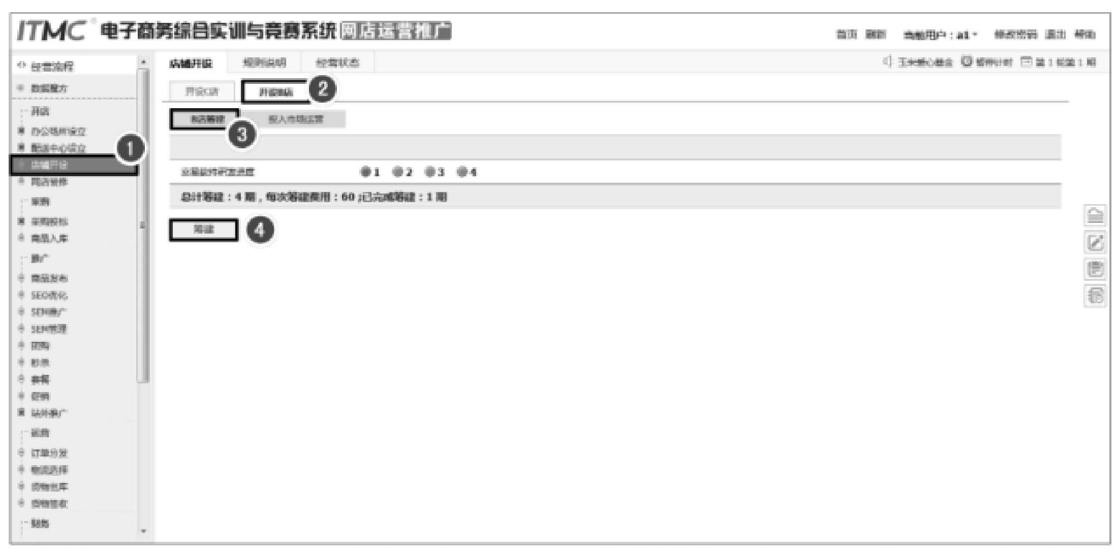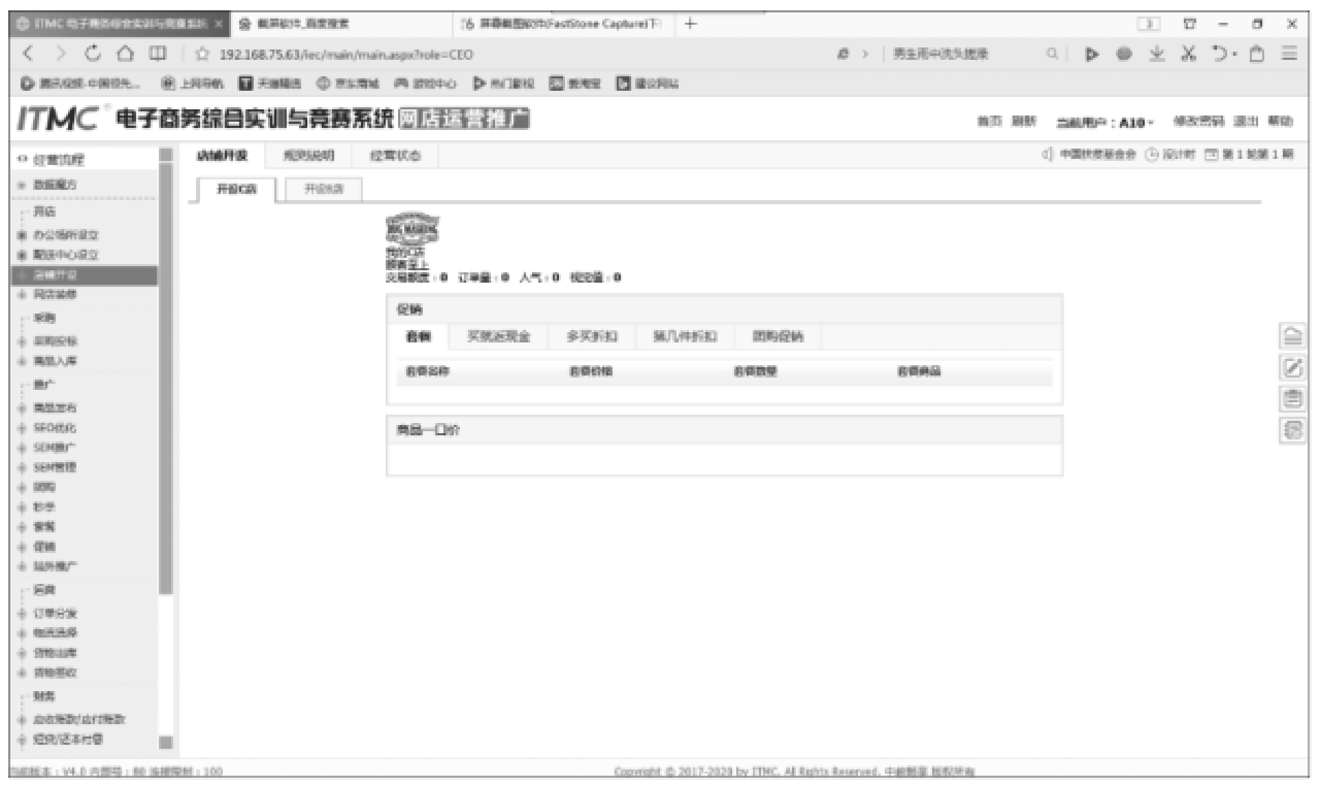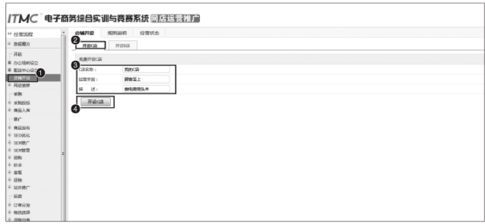 因为ITMC电子商务沙盘系统主要是用于对企业的运营进行练习的,因此系统对C店的开设步骤进行了简化,只需要添加店铺名称、经营宗旨及描述三部分内容,并进行简单设置即可。