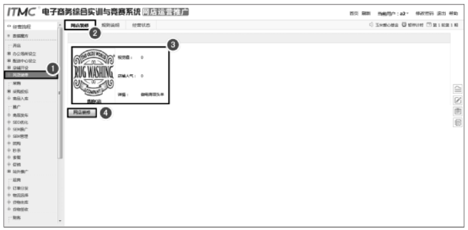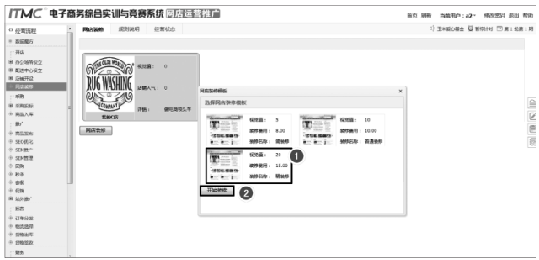 网店装修是指对店铺的招牌、自定义模块、自定义页面,以及商品分类、宝贝详情页等内容进行美化装饰的过程。ITMC电子商务沙盘系统对网店装修的过程进行了简化,模拟企业只需要花费一定的金钱就可以进行网店装修。