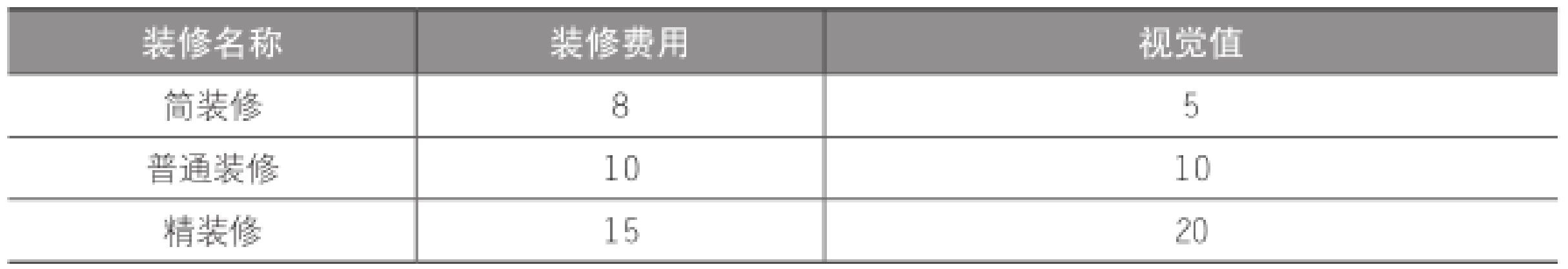 店铺装修分为简装修、普通装修及精装修,每种装修费用及获得的视觉值不同,每种模板的装修费用和视觉值如表3-4所示。店铺装修可获得视觉值与店铺人气,增加综合人群成交机会,并影响各类人群的成交顺序。