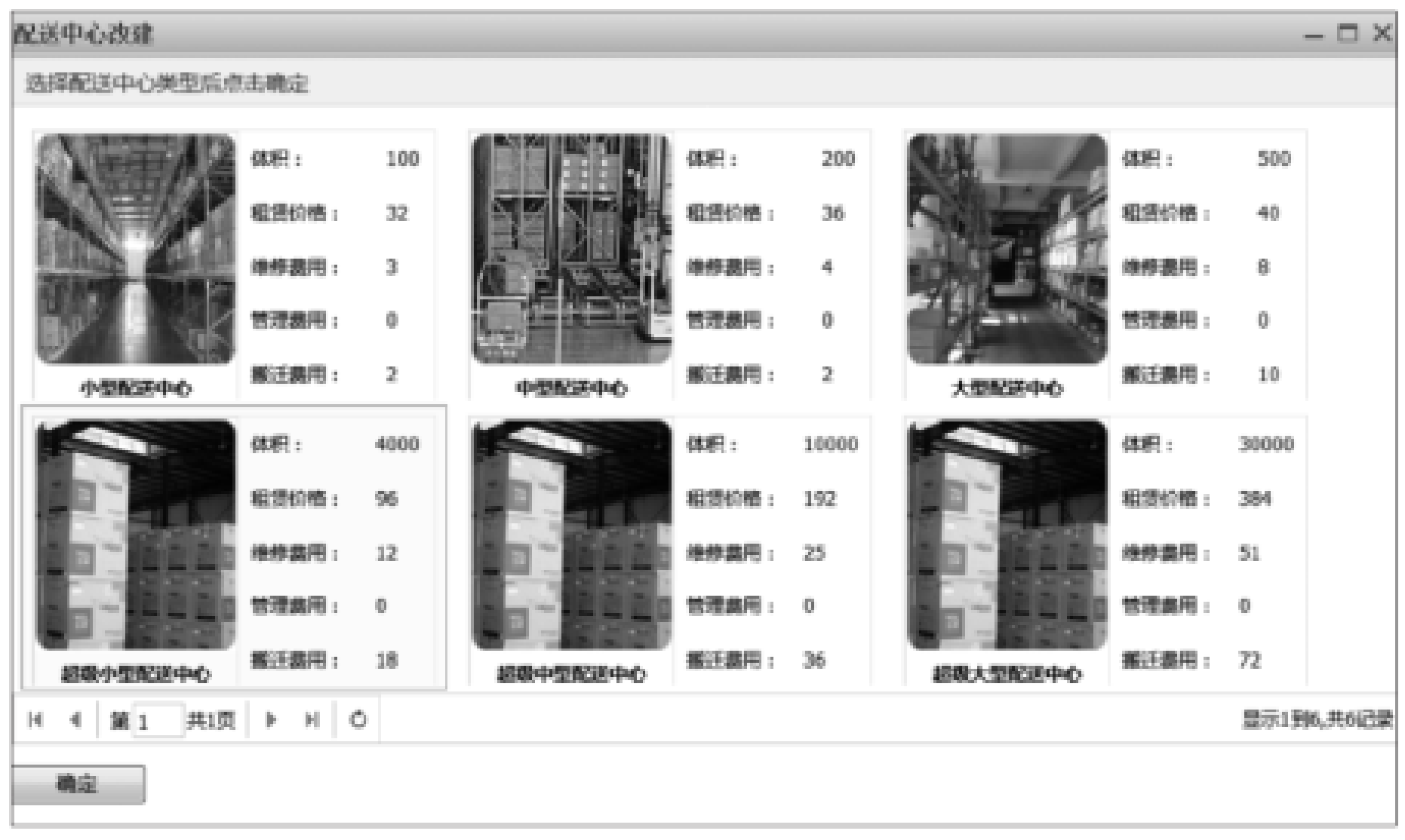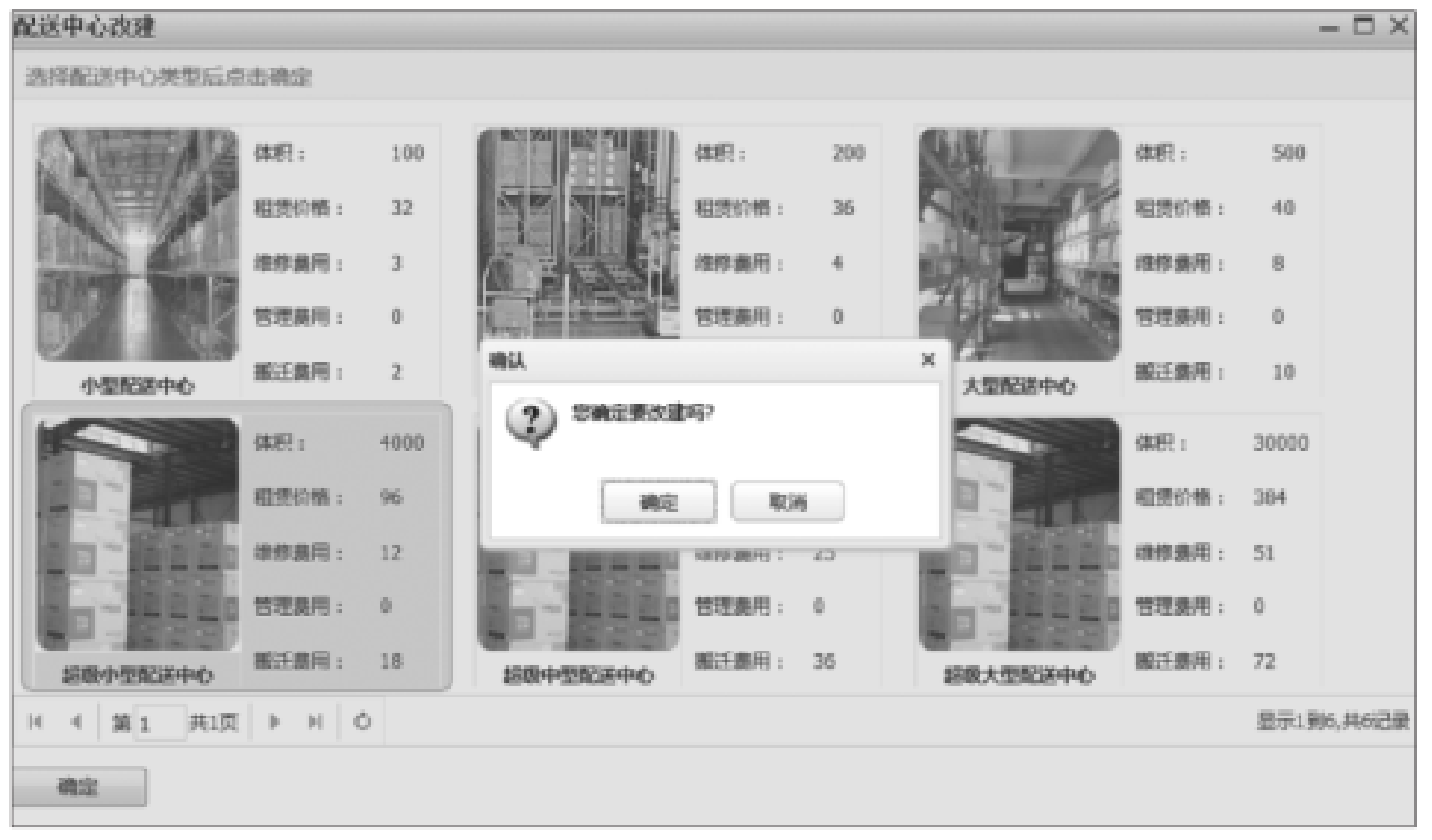 ③ 在图4-12所示的界面中,单击选中要扩建的配送中心,然后单击窗口右上方的“改建”选项,在出现的图4-13所示的对话框中单击要扩建的配送中心类型,单击“确定”按钮即可;
