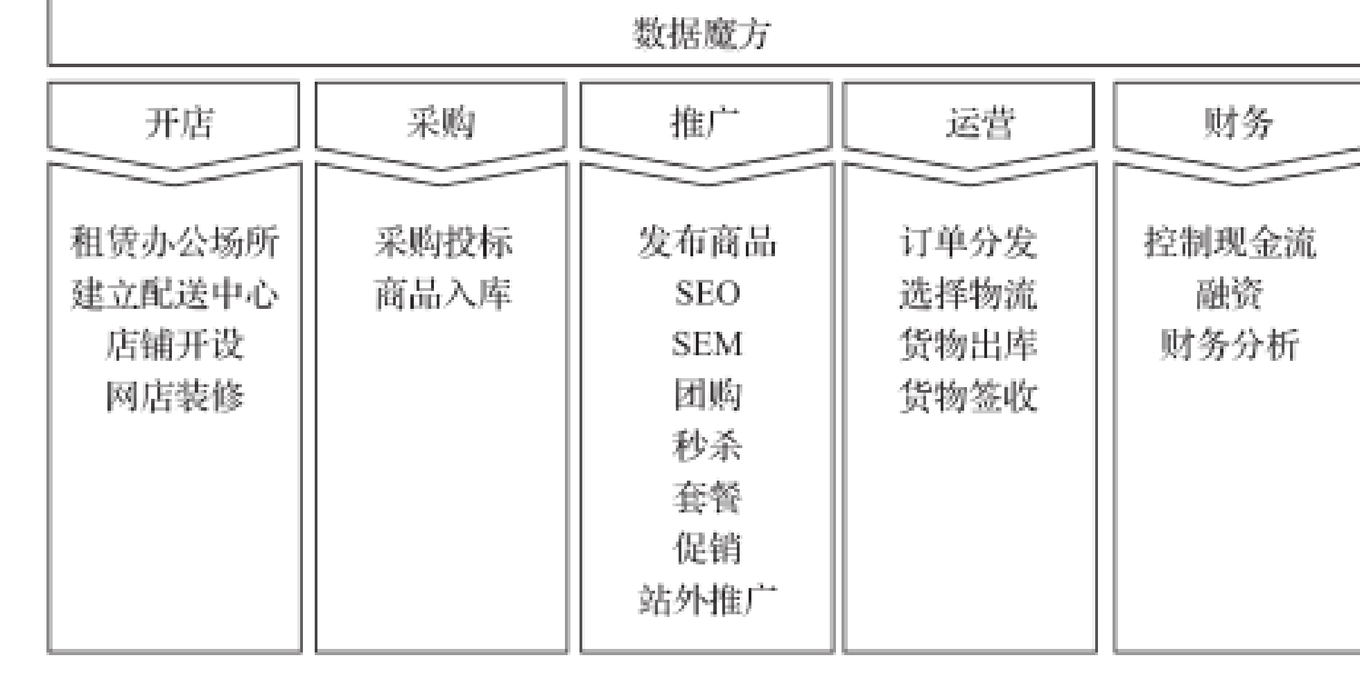 网店运营推广模块要求学生能够通过分析数据魔方提供的数据,决定自己网店的定位和运营策略;并根据经营决策完成开店、推广、运营和财务的流程;通过设立办公场所,建立配送中心,开设店铺;制订采购投标方案,根据采购投标结果完成入库;根据运营数据进行搜索引擎优化操作和进行关键词竞价推广;针对消费人群开展促销活动,制订商品价格,提升转化率;处理订单,配送商品,结算资金;规划资金需求,控制成本,分析财务指标,调整经营策略等,使企业利润最大化,如图1-3所示。