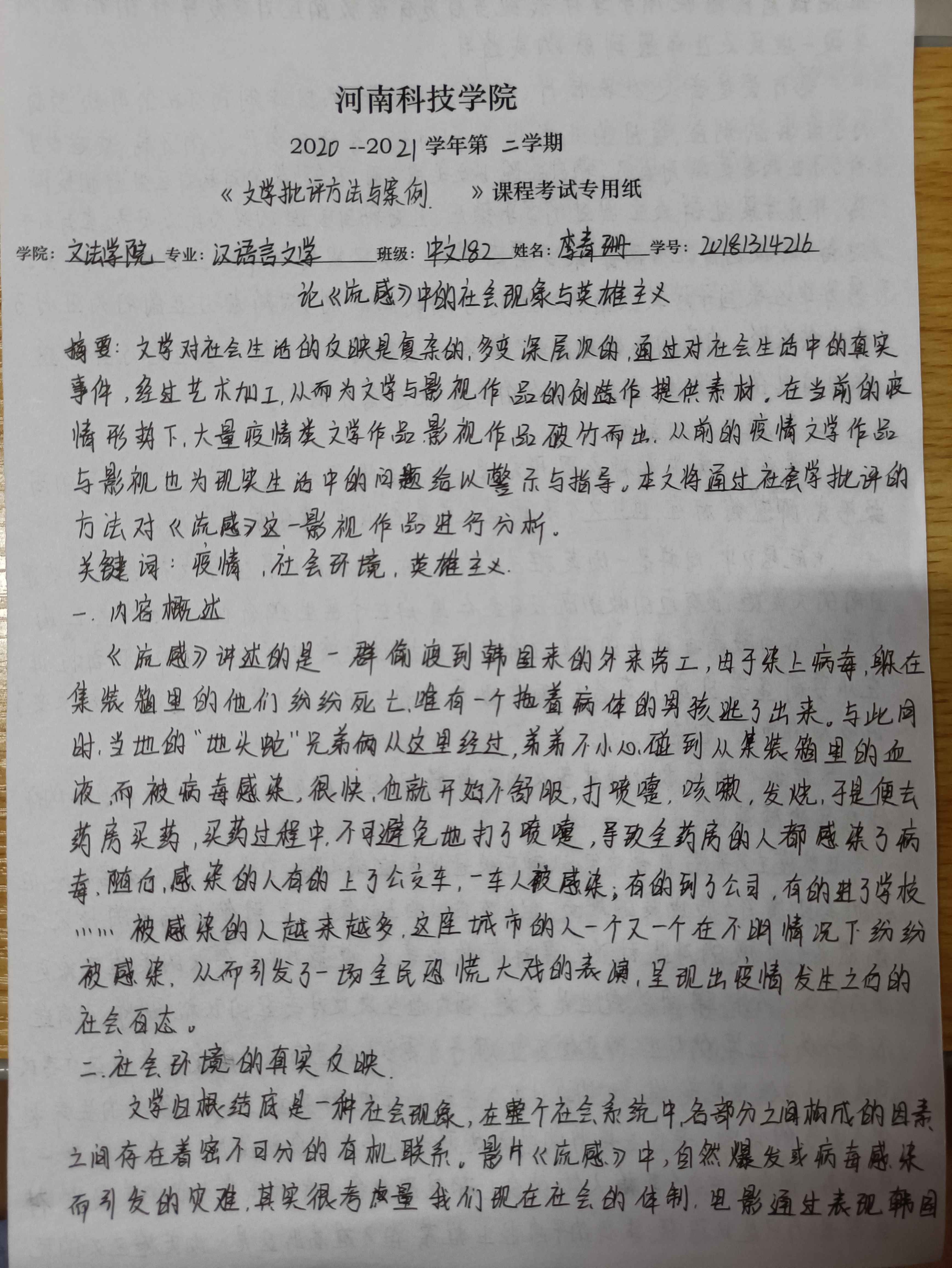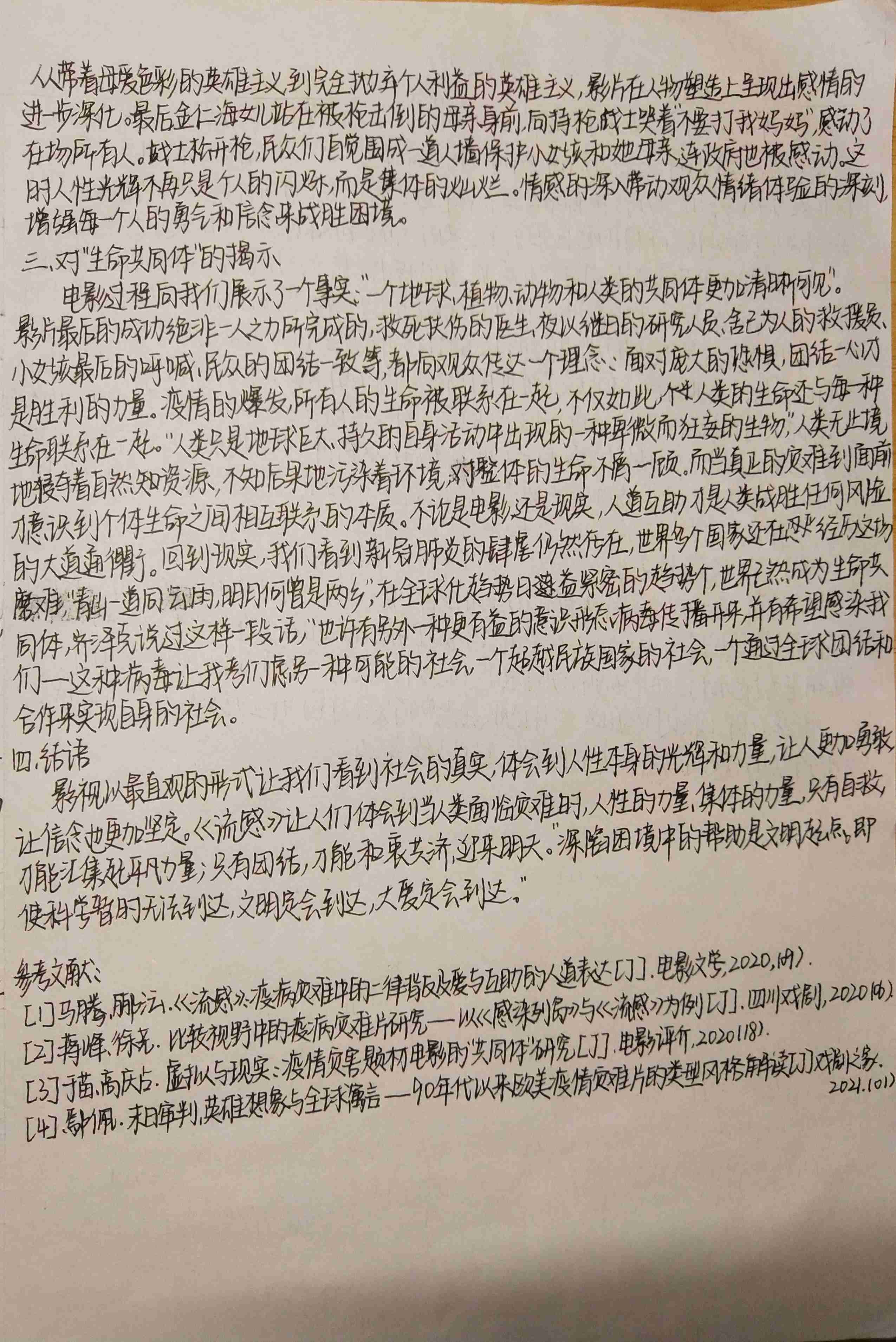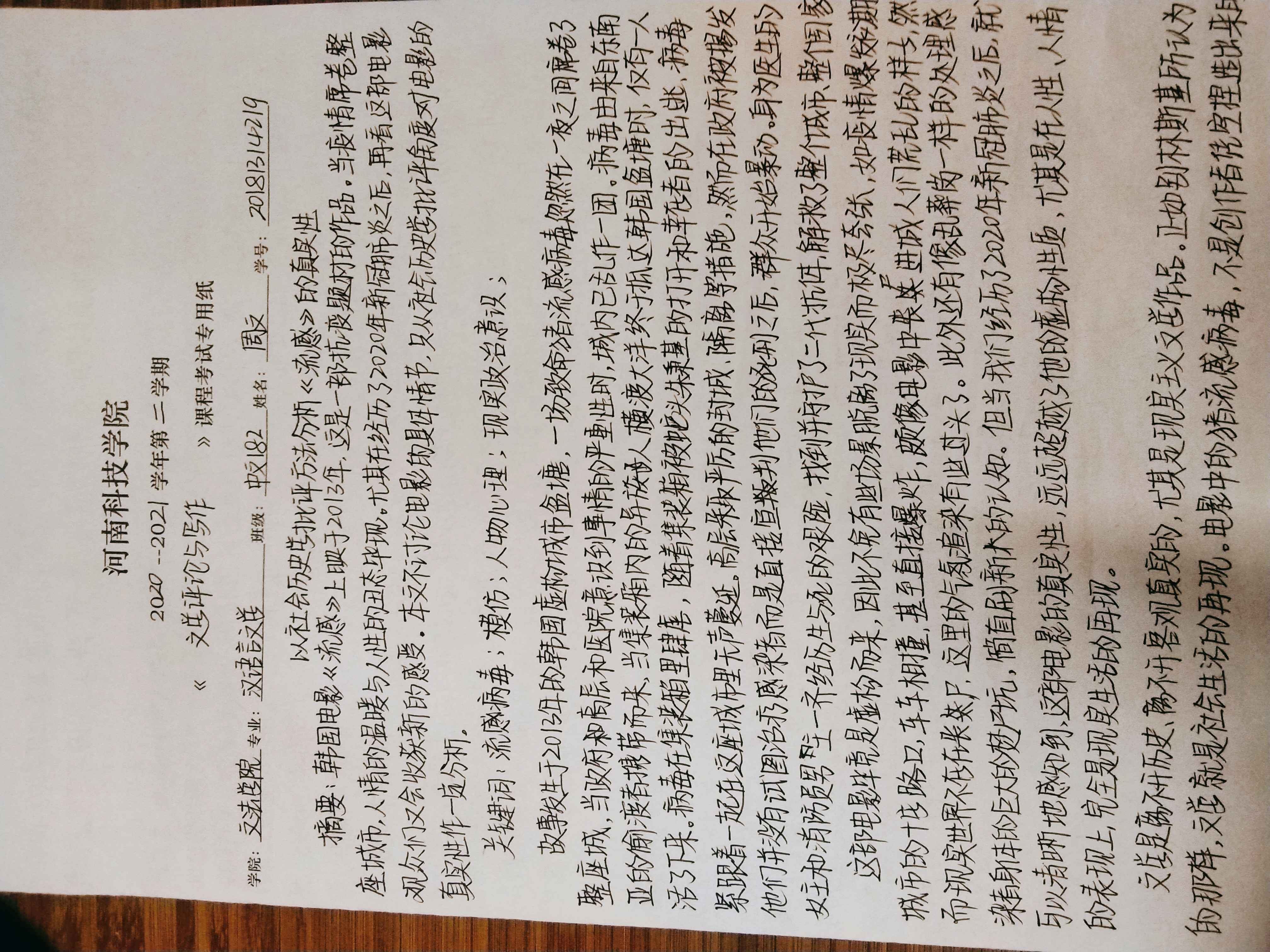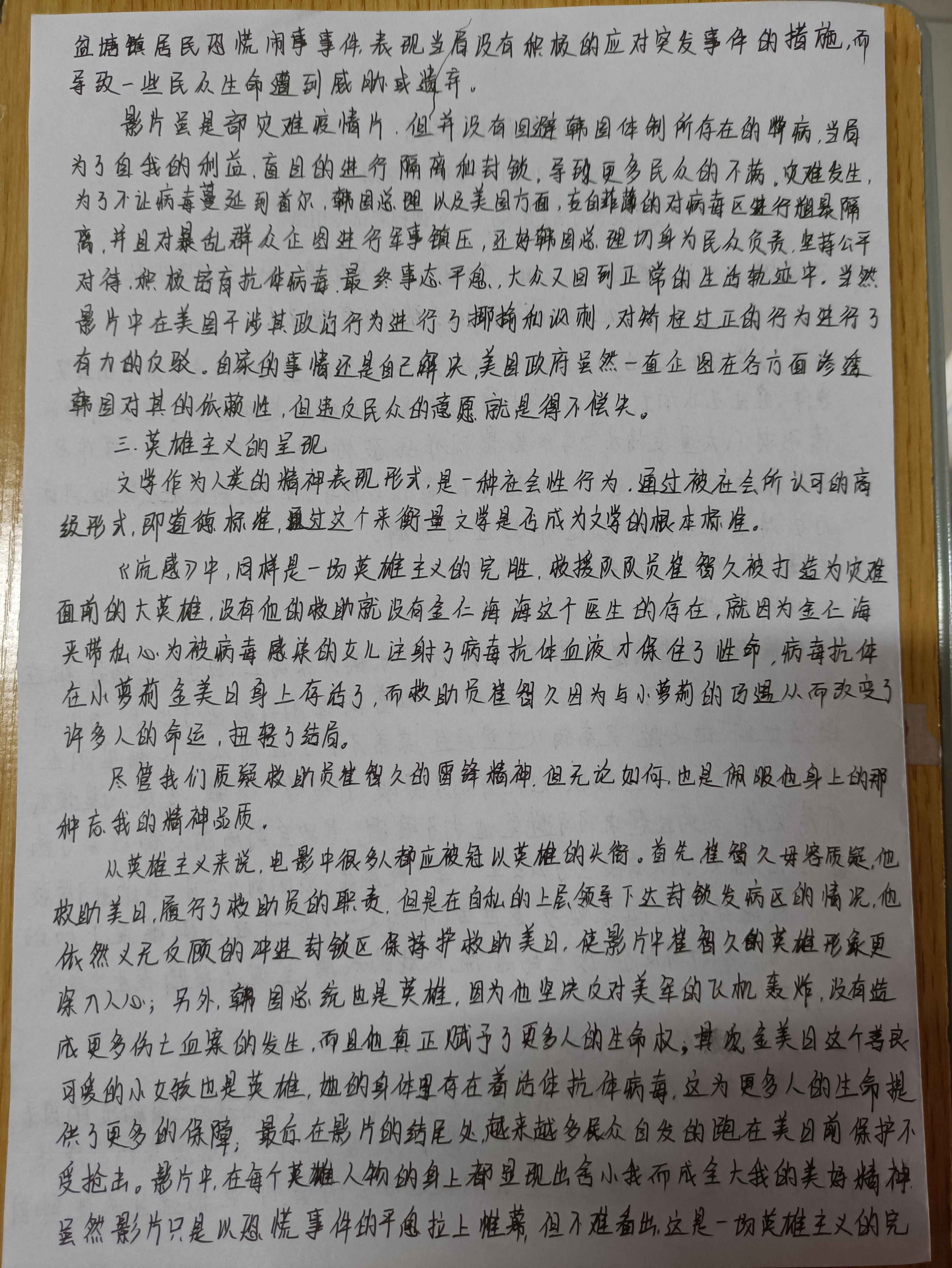 韩国电影《流感》的分析 摘要:运用文学批评的方法的知识对文艺作品进行分析,论文以韩国电影《流感》为题材,写出自己对于它的分析和见解,了解人们在疫情面前进行的选择和恐惧,同时写出了个人对本门课程的心得体会。 关键词:病毒、文学意识形态批评、疫情措施、心得体会 电影讲的是:一群东南亚偷渡客历经艰险来到韩国,但是整个集装箱内的偷渡客除了一人全部死亡,他(孟瑟)带着猪流感病毒逃脱,被被感染的韩国蛇头(朱秉基)的弟弟(朱秉宇)去药店,将病毒传给了周围所有人。女医生金仁海(女主)是一位单身妈妈,她不久前遭遇一场车祸,幸被消防队救援人员姜智久(男主)救出,却因丢失重要论文资料而备受上司苛责。值此期间,朱秉宇因流感送入仁海的医院治疗,经诊断终于发现流感的起因。未过多久,猪流感病毒成几何式爆发蔓延,人们纷纷被传染了病毒,被集中隔离,得病的人被带走集中焚尸,金仁海将从孟瑟身上提取的血清注入患病的女儿(金美日)身上,后来隔离区发生暴动,孟瑟死亡,但是在金美日身上发现抗体,政府放弃武力镇压,盆塘人们获救。 在电影中盆塘的人们发现“治疗”的真相就是把患病的人集中焚尸,他们发生了暴动想冲破政府的隔离,而其中一个患病的官员全国焕喊到:他们要去到首尔,让首尔的人也出现感染者,政府才会救他们。这句话虽然跟疯狂,有着愤世嫉俗的反社会倾向,但是却道出了一定的社会现实。政府的高官、财阀大部分集中在首尔,在流感疯狂传播、无法抑制的时候,他们首先想到的是自己的安危,甚至想要放弃所有留在盆塘的平民。 这里面体现出来了文学的意识形态批评。文学的意识形态批评,指的是以一定的阶级、党派立场对文学作品进行分析、研究,其目的就是说明,一切文学作品都具有意识形态的性质。这里面平民阶级为了活着不惜加大感染者使上层阶级救他们。而作为国家的上层阶级为了全国人民甚至有放弃盆塘所有的人的念头,还好最后发现了抗体,停止了射杀。 这里从这两个阶级的角度进行拍摄,无法说清楚谁对谁错,立场不同进行的选择就不同。可是如果每个人都是被放弃的那一个,那么势必会进行反击为自己某一线生机。面对自己的国民应该负责,进行最大限度的救治而不是进行镇压,否则有可能发生更大的危机,而人们在危险中更应该保持清醒的理智,不要被恐惧占据了头脑,做出一些无可挽回的灾难。所以,政府和民众之间应该相互信任,携手共度难关。 虽然文学的真实性与现实没有关系,文学需要只能在文学本文内部有效的“假陈述”,它不能直接指称现实,只能引起我们前后一致的情感反应。可是文学却是来源于现实而高于现实,对我们的现实生活具有一定的意义和影响。如果我们面临了疫情应该怎么做呢? ①对病毒加强监测,扩大监测网络,监测人间流感病毒,及时发现流感变异成分,为抗药性预测及疫苗制备提供参考。②针对流感监测结果,及时发现流感变异株,尽早研究疫苗,做好流感大流行应对准备。疫苗研制。③流行早期,做好传染源隔离,防止疫情传播及流行。④加强个人防护及健康教育,能提升人群防患能力,加大宣传力度,增强公民防控意识。 心得体会:学习了“文学评论与写作”这门课程,我知道了文学批评的众多方法,也学习了许多名人名家的经典案例,丰富了自己的知识储备,拓宽了自己的知识视野。也知道了前人先贤在文学批评道路上的艰辛与不易,让自己懂得了在求索知识的道路上应该不畏艰辛,砥砺前行,在前人的基础上勇于继承和创新。这一学期即将结束,本门课程即将完结,非常感谢苏老师对我们谆谆教导,上课严谨负责,每节课都很敬业的向我们传授着知识,而且运用微助教公众号的方式使线上线下的教学联系在一起,线上学习在线讨论,将同学们的学习、讨论数字化,使同学们可以看见自己的学习成果,提高了我们的学习效率和知识的灵活运用度,增加了对学习的兴趣,使我们受益匪浅。 参考文献: [1]邱运华.文学批评与案例(第二版).北京大学出版社 [2]胡丽娜.中西医结合防控甲流HINI流感疫情临床观察.西平县中医院,河南马店