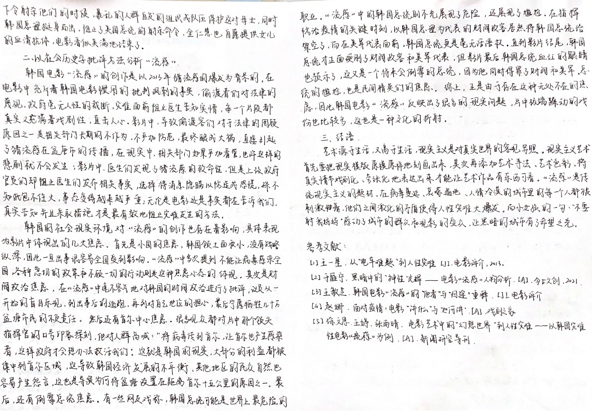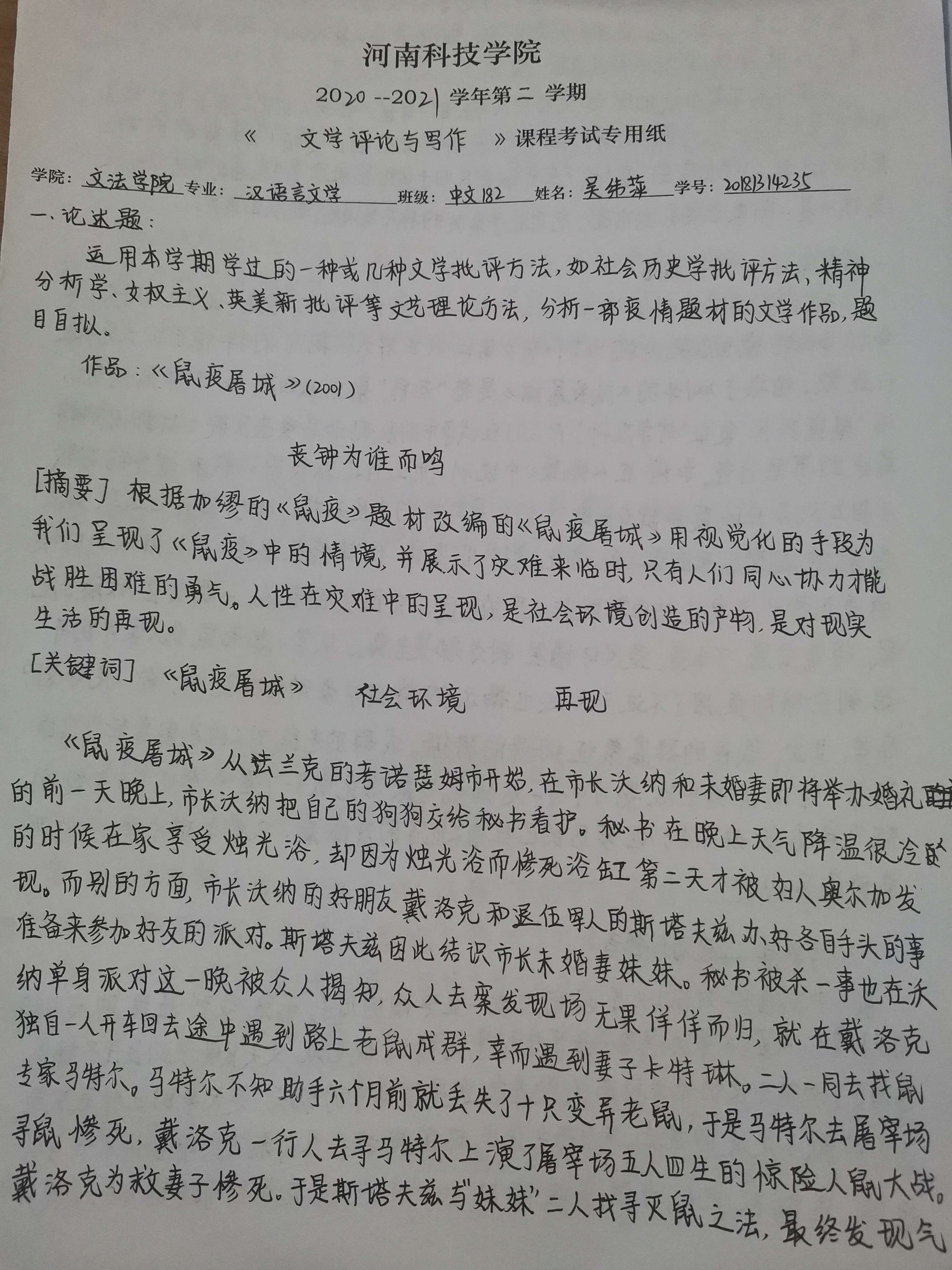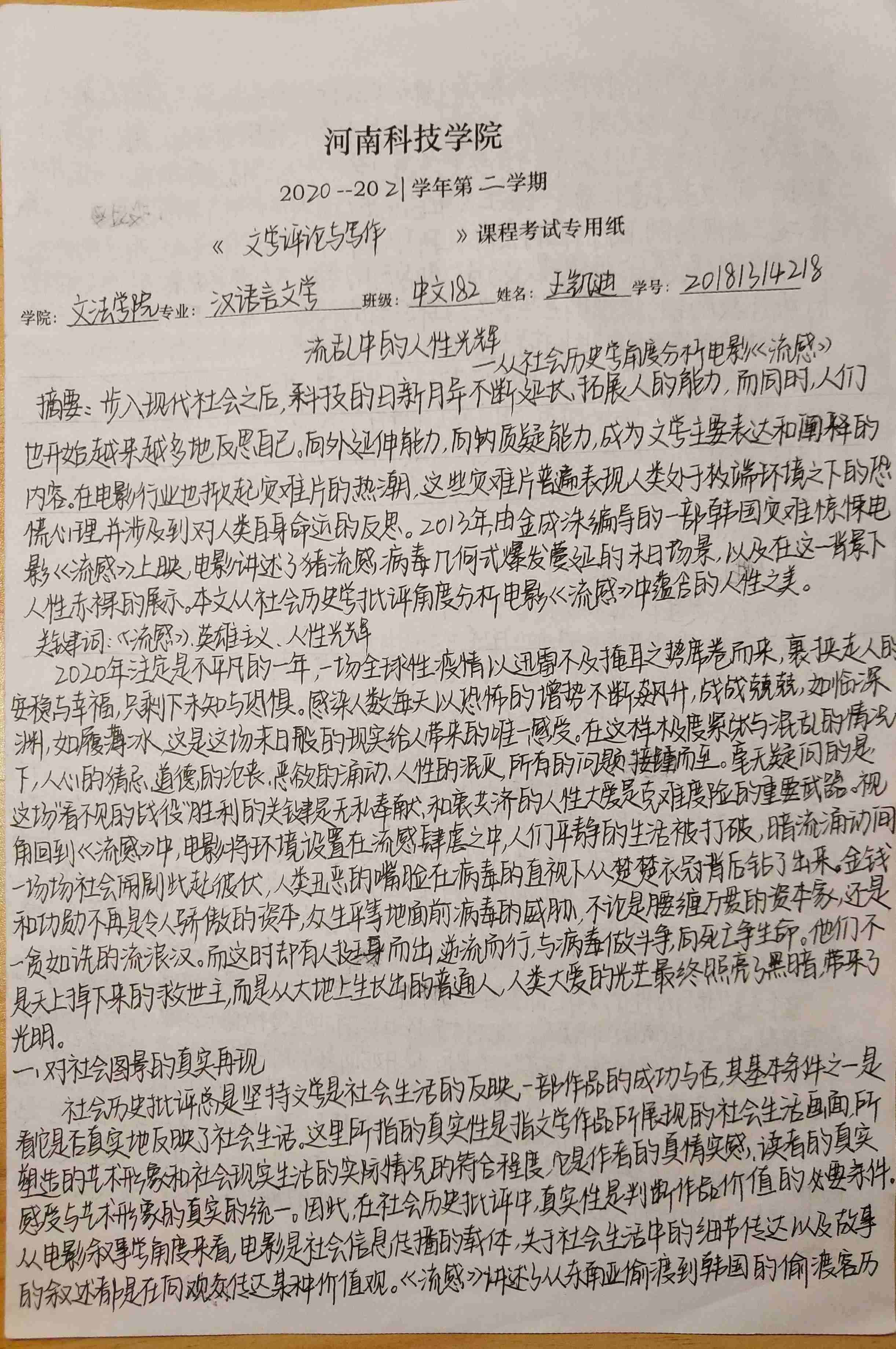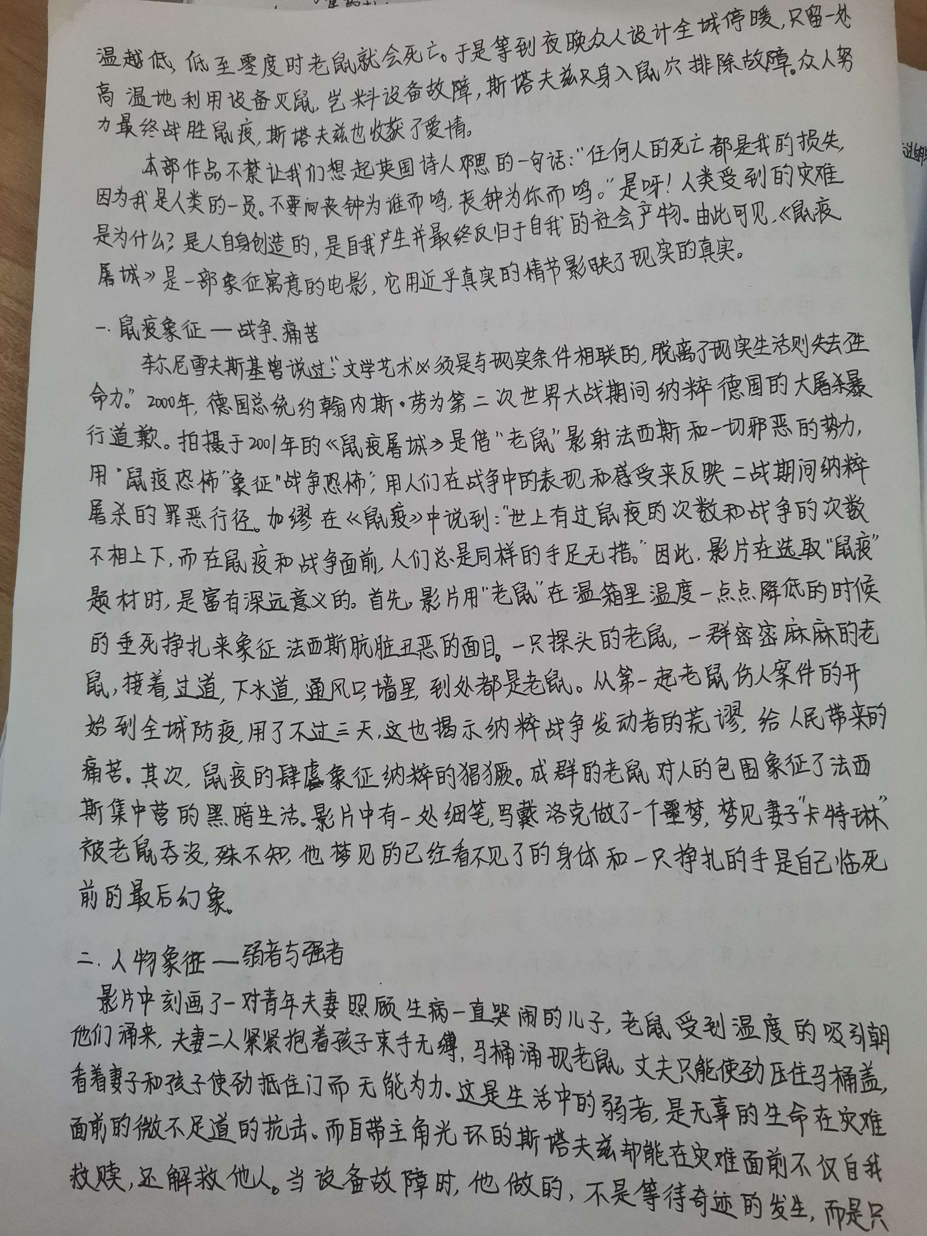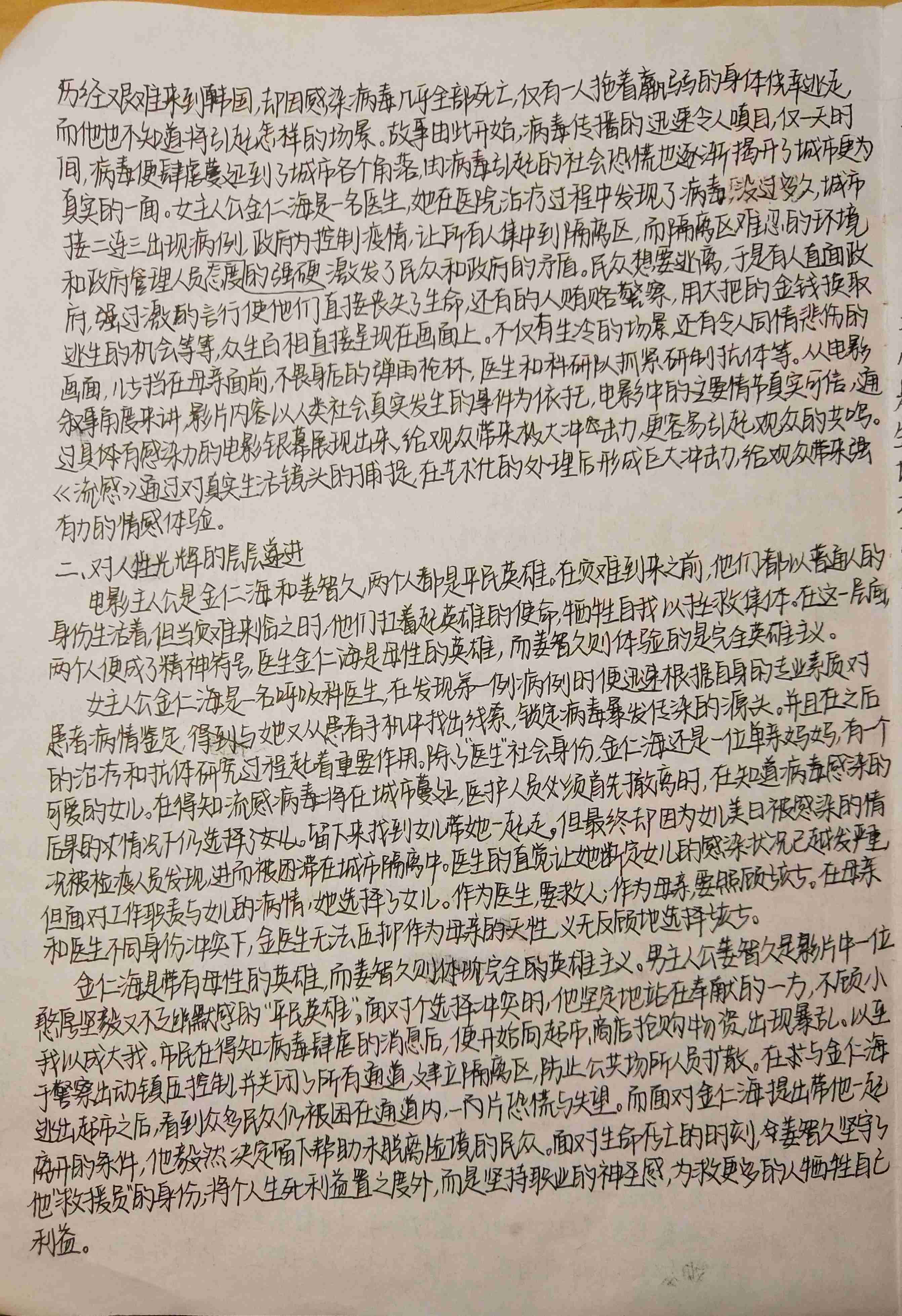 韩国电影《流感》的分析 摘要:运用文学批评的方法的知识对文艺作品进行分析,论文以韩国电影《流感》为题材,写出自己对于它的分析和见解,了解人们在疫情面前进行的选择和恐惧,同时写出了个人对本门课程的心得体会。 关键词:病毒、文学意识形态批评、疫情措施、心得体会 电影讲的是:一群东南亚偷渡客历经艰险来到韩国,但是整个集装箱内的偷渡客除了一人全部死亡,他(孟瑟)带着猪流感病毒逃脱,被被感染的韩国蛇头(朱秉基)的弟弟(朱秉宇)去药店,将病毒传给了周围所有人。女医生金仁海(女主)是一位单身妈妈,她不久前遭遇一场车祸,幸被消防队救援人员姜智久(男主)救出,却因丢失重要论文资料而备受上司苛责。值此期间,朱秉宇因流感送入仁海的医院治疗,经诊断终于发现流感的起因。未过多久,猪流感病毒成几何式爆发蔓延,人们纷纷被传染了病毒,被集中隔离,得病的人被带走集中焚尸,金仁海将从孟瑟身上提取的血清注入患病的女儿(金美日)身上,后来隔离区发生暴动,孟瑟死亡,但是在金美日身上发现抗体,政府放弃武力镇压,盆塘人们获救。 在电影中盆塘的人们发现“治疗”的真相就是把患病的人集中焚尸,他们发生了暴动想冲破政府的隔离,而其中一个患病的官员全国焕喊到:他们要去到首尔,让首尔的人也出现感染者,政府才会救他们。这句话虽然跟疯狂,有着愤世嫉俗的反社会倾向,但是却道出了一定的社会现实。政府的高官、财阀大部分集中在首尔,在流感疯狂传播、无法抑制的时候,他们首先想到的是自己的安危,甚至想要放弃所有留在盆塘的平民。 这里面体现出来了文学的意识形态批评。文学的意识形态批评,指的是以一定的阶级、党派立场对文学作品进行分析、研究,其目的就是说明,一切文学作品都具有意识形态的性质。这里面平民阶级为了活着不惜加大感染者使上层阶级救他们。而作为国家的上层阶级为了全国人民甚至有放弃盆塘所有的人的念头,还好最后发现了抗体,停止了射杀。 这里从这两个阶级的角度进行拍摄,无法说清楚谁对谁错,立场不同进行的选择就不同。可是如果每个人都是被放弃的那一个,那么势必会进行反击为自己某一线生机。面对自己的国民应该负责,进行最大限度的救治而不是进行镇压,否则有可能发生更大的危机,而人们在危险中更应该保持清醒的理智,不要被恐惧占据了头脑,做出一些无可挽回的灾难。所以,政府和民众之间应该相互信任,携手共度难关。 虽然文学的真实性与现实没有关系,文学需要只能在文学本文内部有效的“假陈述”,它不能直接指称现实,只能引起我们前后一致的情感反应。可是文学却是来源于现实而高于现实,对我们的现实生活具有一定的意义和影响。如果我们面临了疫情应该怎么做呢? ①对病毒加强监测,扩大监测网络,监测人间流感病毒,及时发现流感变异成分,为抗药性预测及疫苗制备提供参考。②针对流感监测结果,及时发现流感变异株,尽早研究疫苗,做好流感大流行应对准备。疫苗研制。③流行早期,做好传染源隔离,防止疫情传播及流行。④加强个人防护及健康教育,能提升人群防患能力,加大宣传力度,增强公民防控意识。 心得体会:学习了“文学评论与写作”这门课程,我知道了文学批评的众多方法,也学习了许多名人名家的经典案例,丰富了自己的知识储备,拓宽了自己的知识视野。也知道了前人先贤在文学批评道路上的艰辛与不易,让自己懂得了在求索知识的道路上应该不畏艰辛,砥砺前行,在前人的基础上勇于继承和创新。这一学期即将结束,本门课程即将完结,非常感谢苏老师对我们谆谆教导,上课严谨负责,每节课都很敬业的向我们传授着知识,而且运用微助教公众号的方式使线上线下的教学联系在一起,线上学习在线讨论,将同学们的学习、讨论数字化,使同学们可以看见自己的学习成果,提高了我们的学习效率和知识的灵活运用度,增加了对学习的兴趣,使我们受益匪浅。 参考文献: [1]邱运华.文学批评与案例(第二版).北京大学出版社 [2]胡丽娜.中西医结合防控甲流HINI流感疫情临床观察.西平县中医院,河南马店