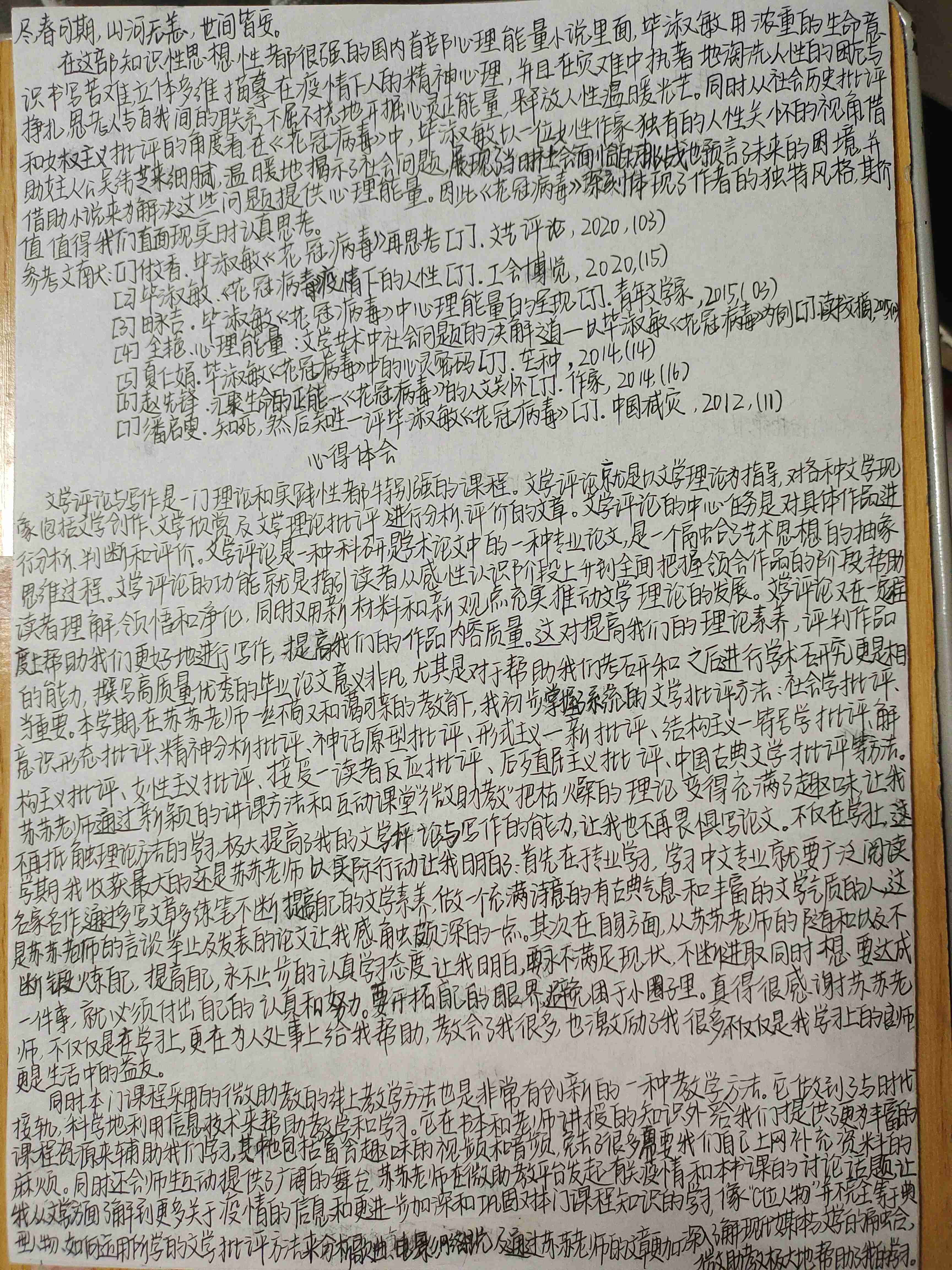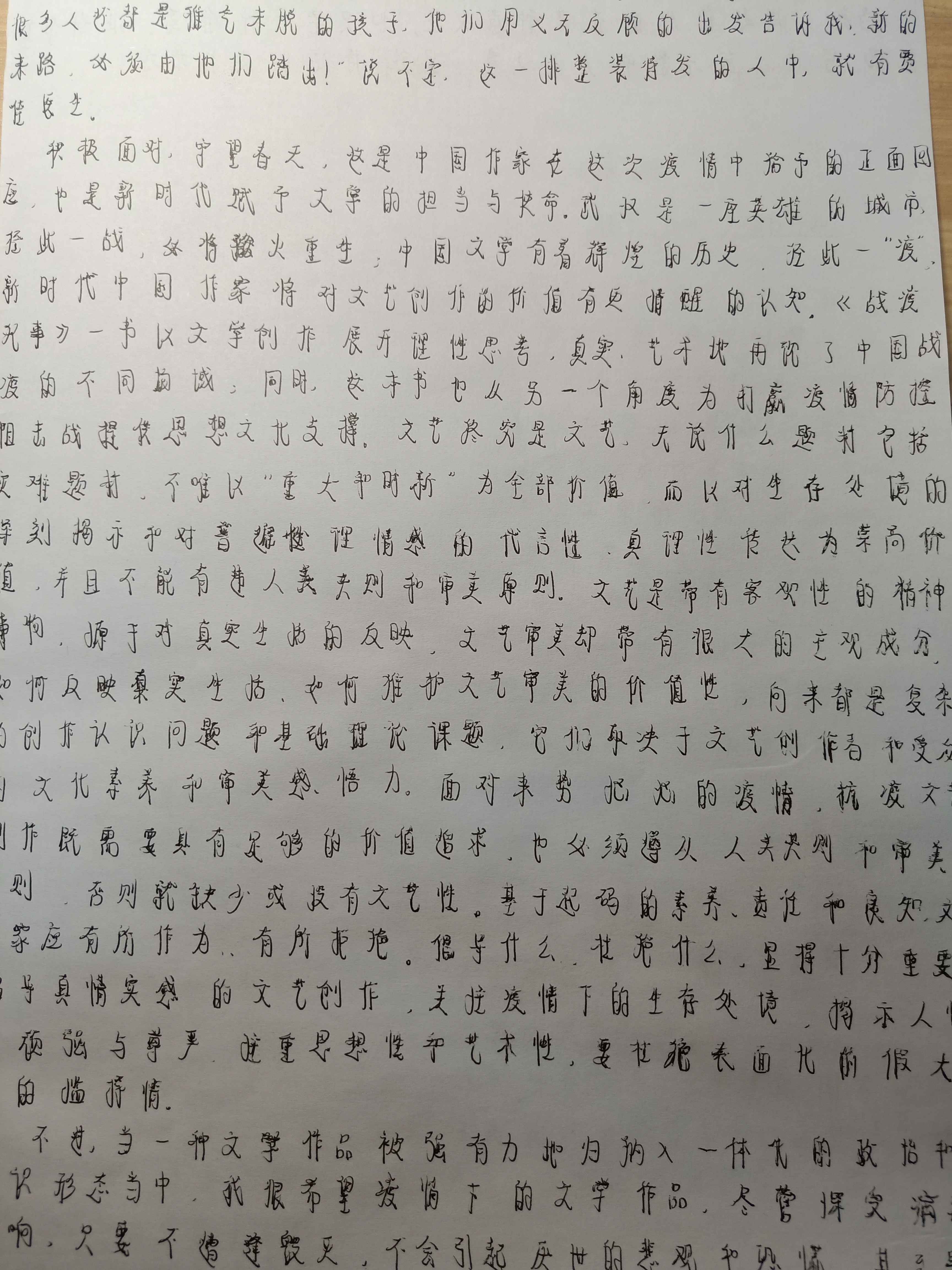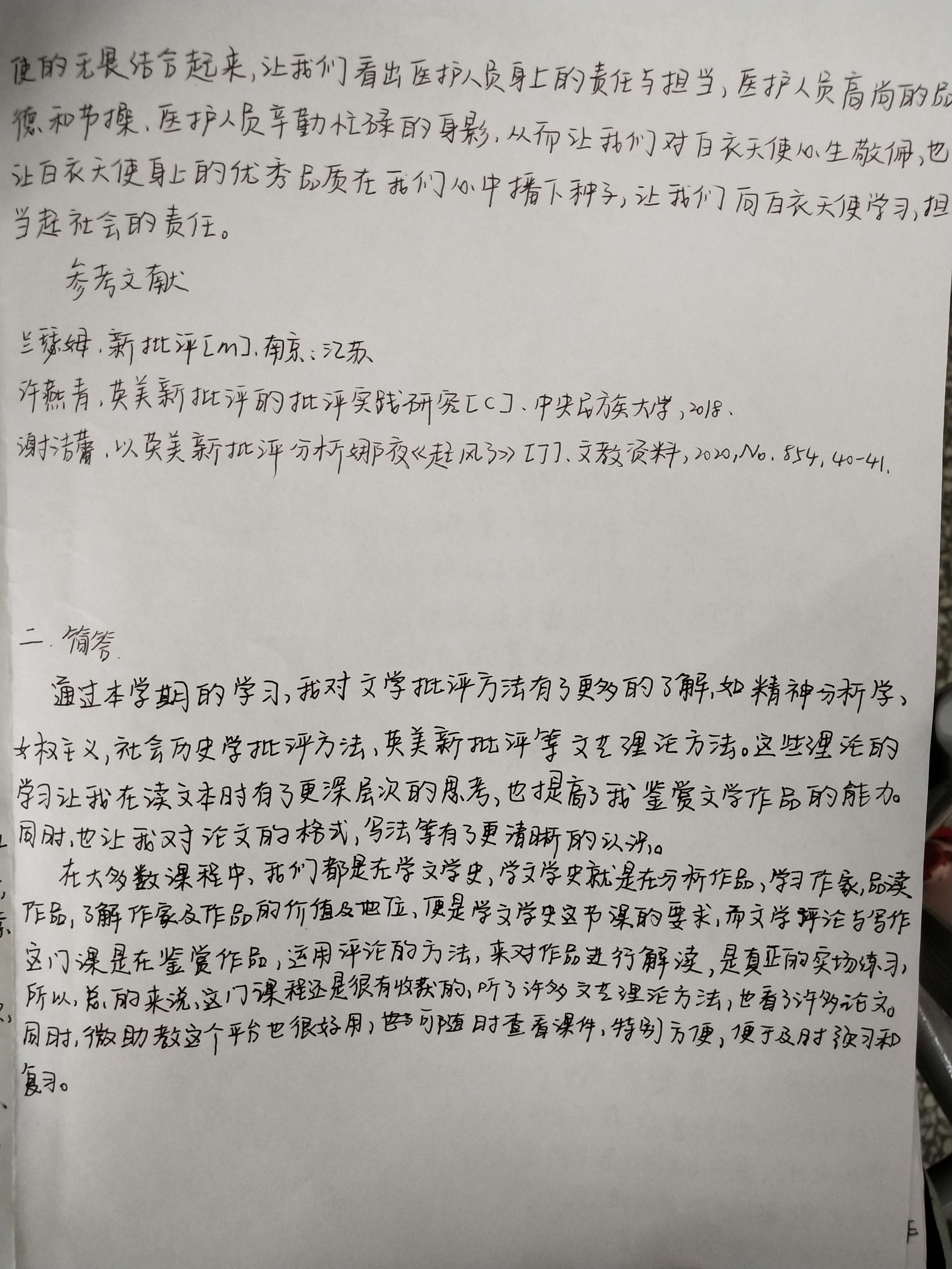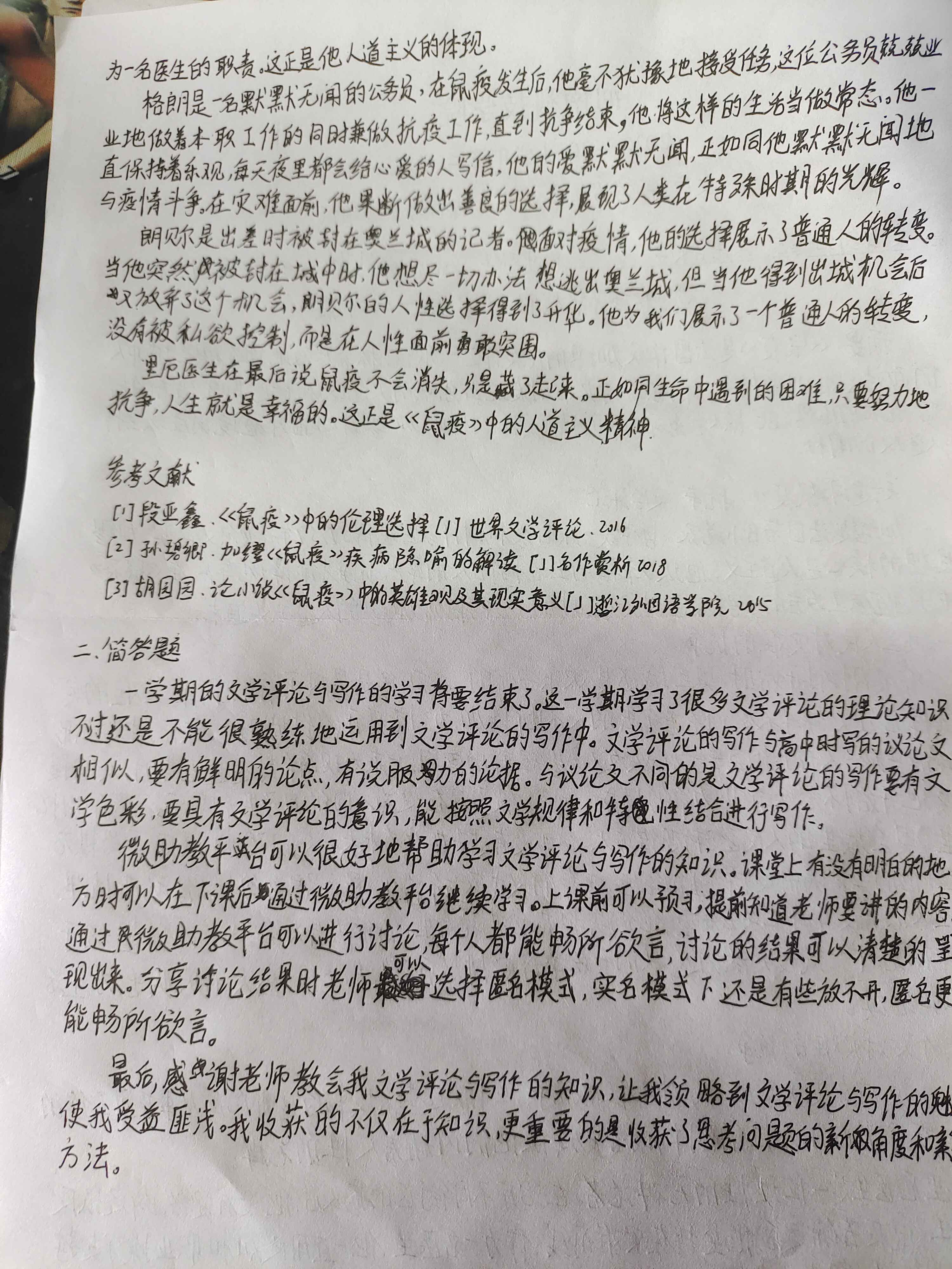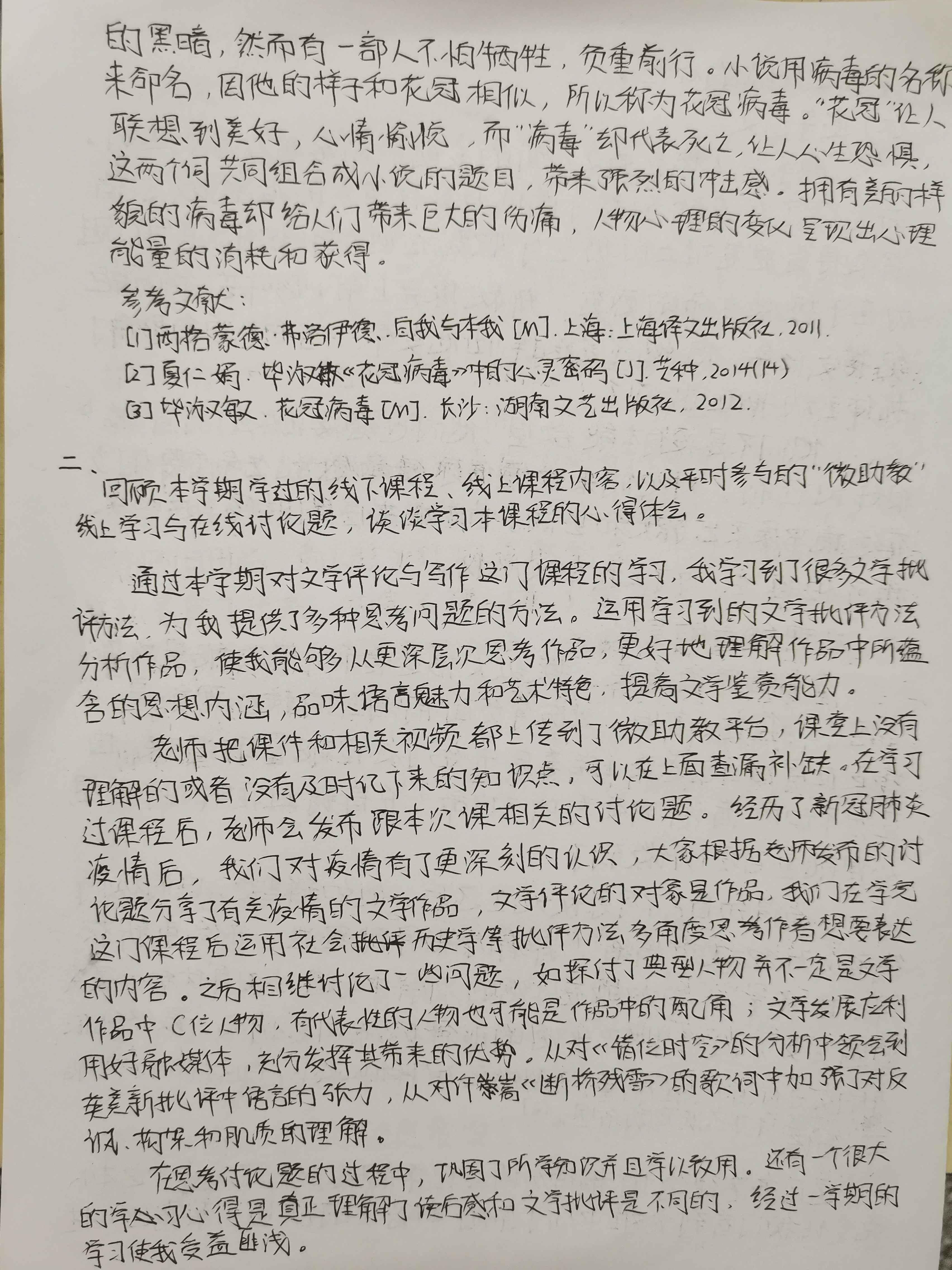 请同学们把期末考察作业即“关于疫情文学的评论”完成后,在微助教平台同时发送一份,(可以是拍照上传,也可以用讯飞手写字转word后进行电子版上传),辛苦大家啦,谢谢!