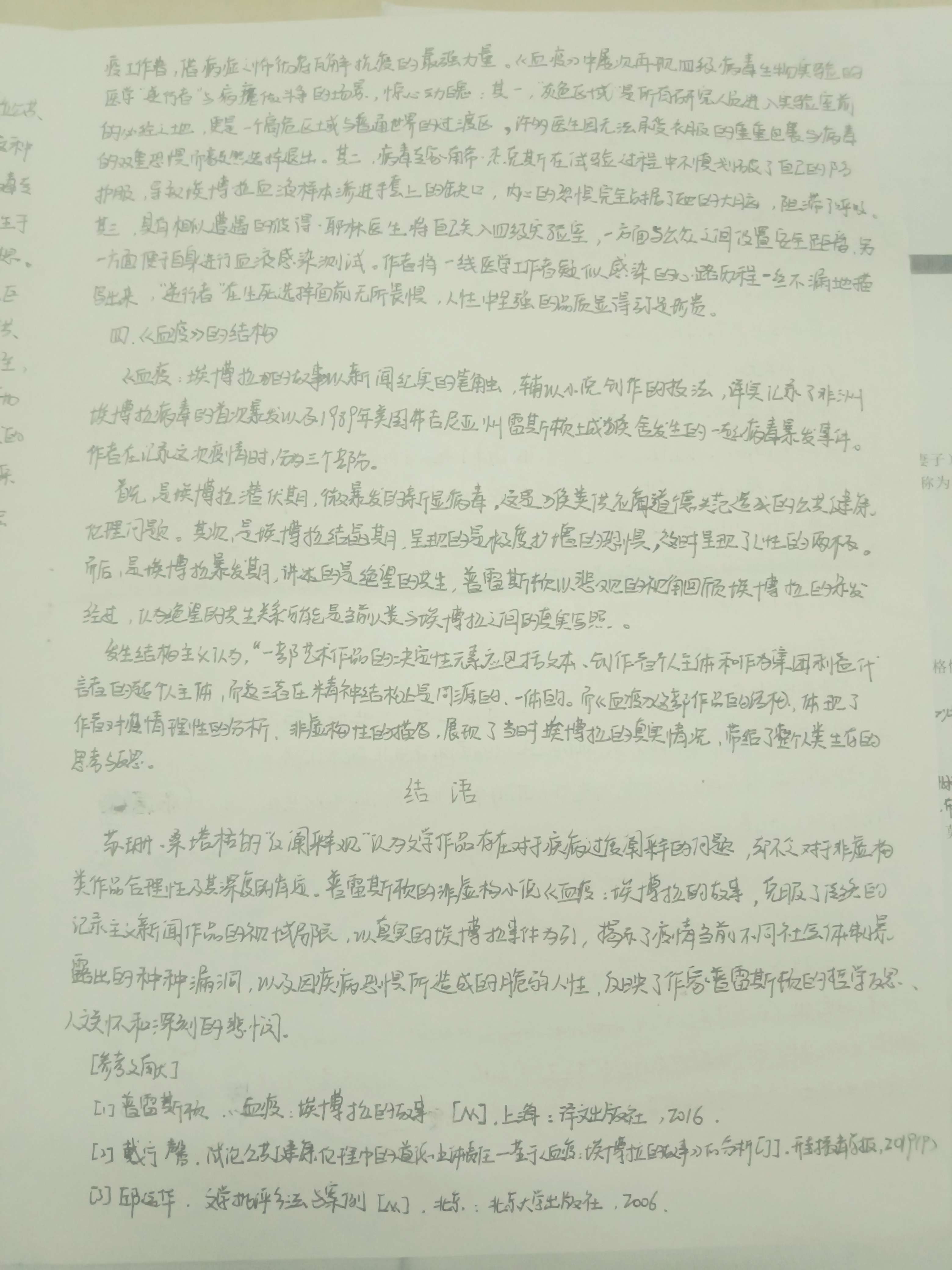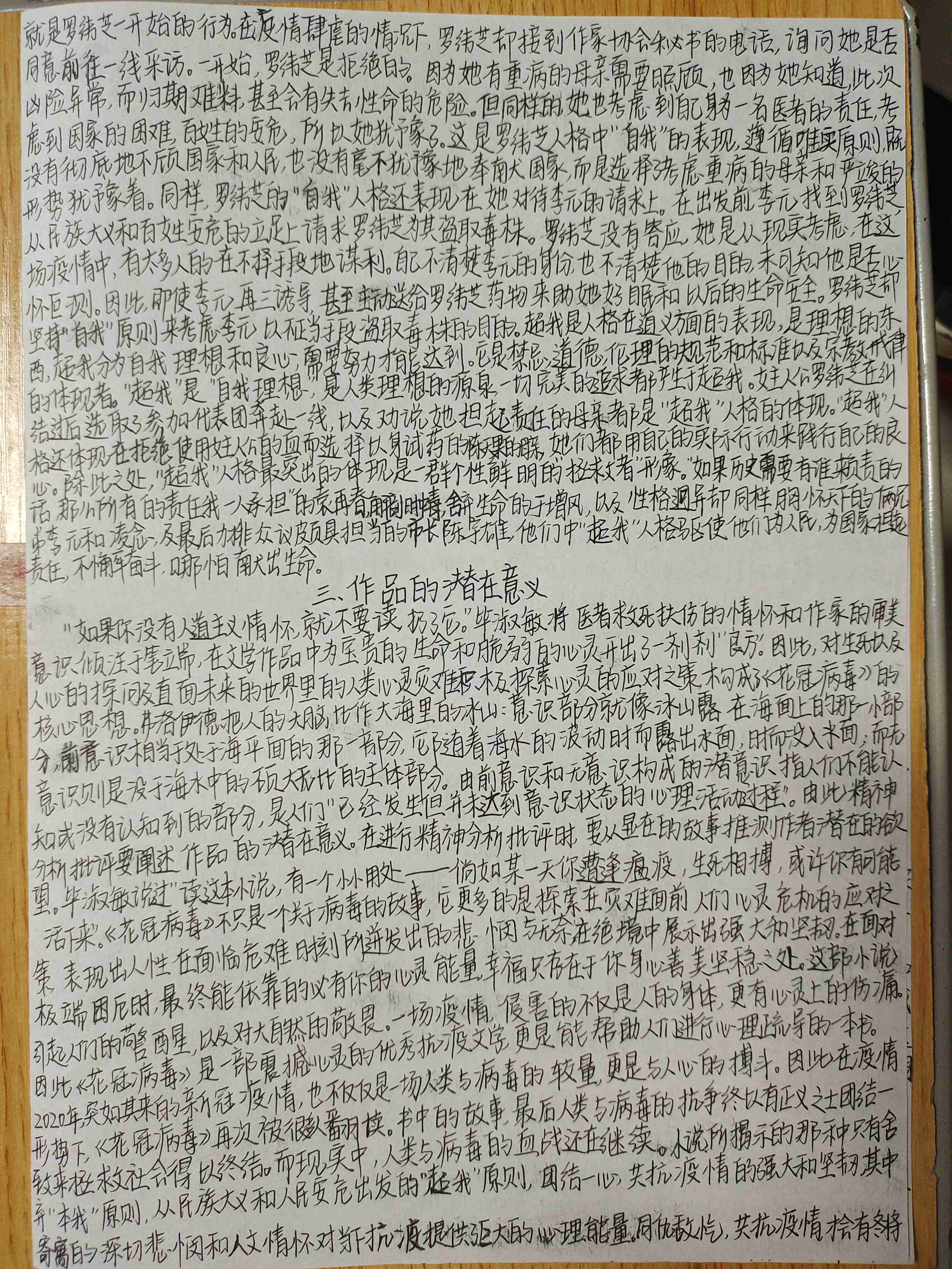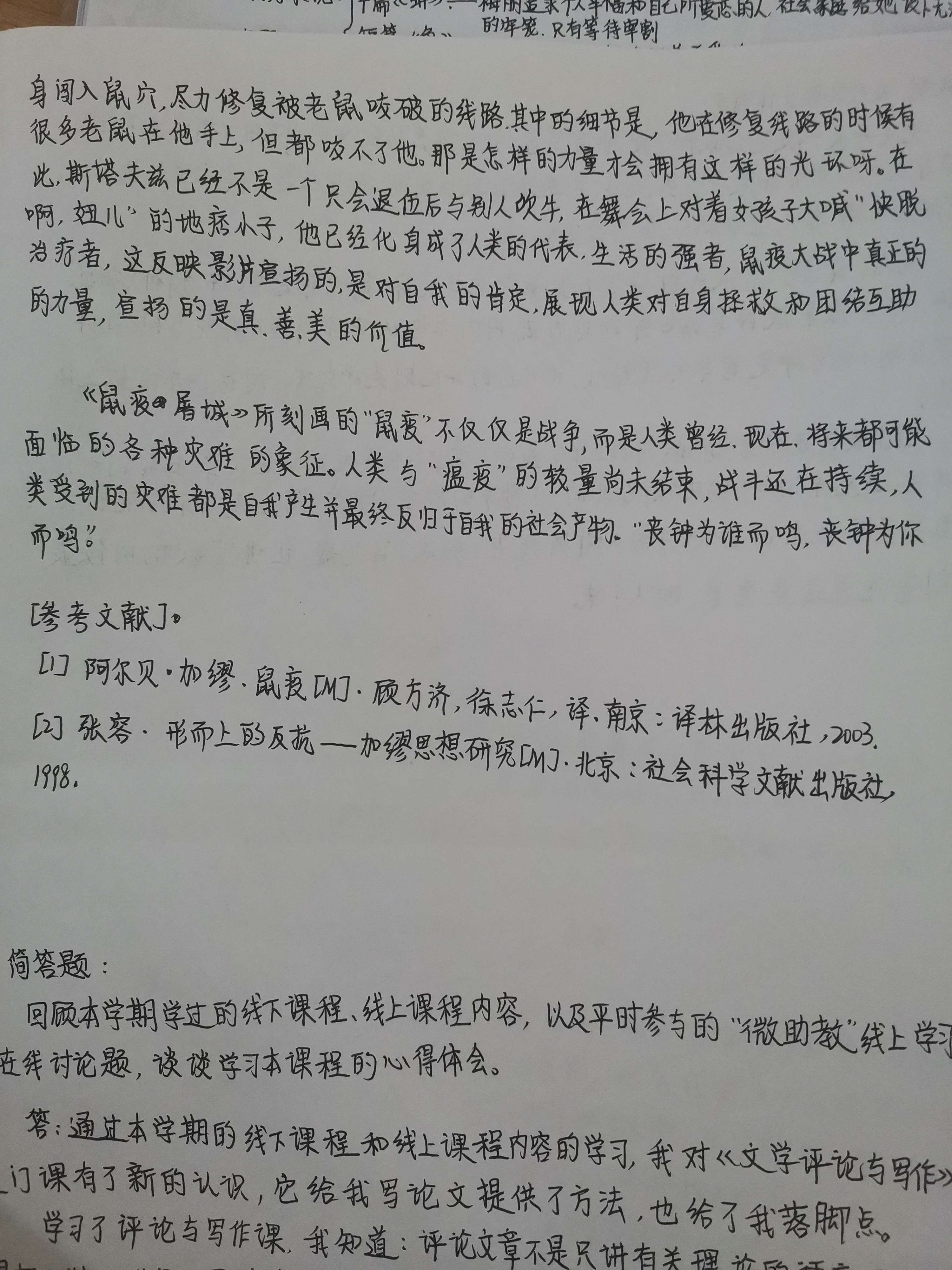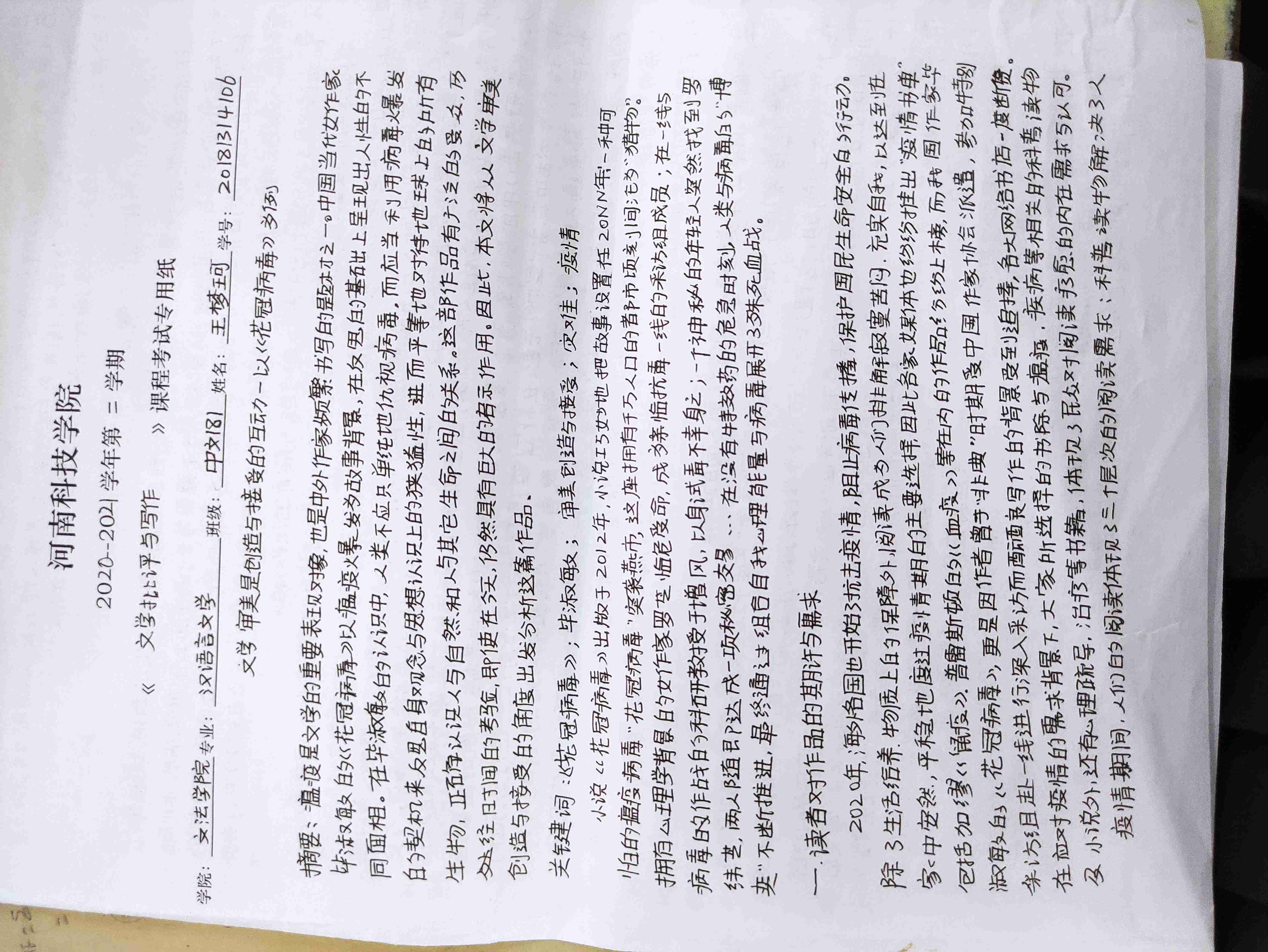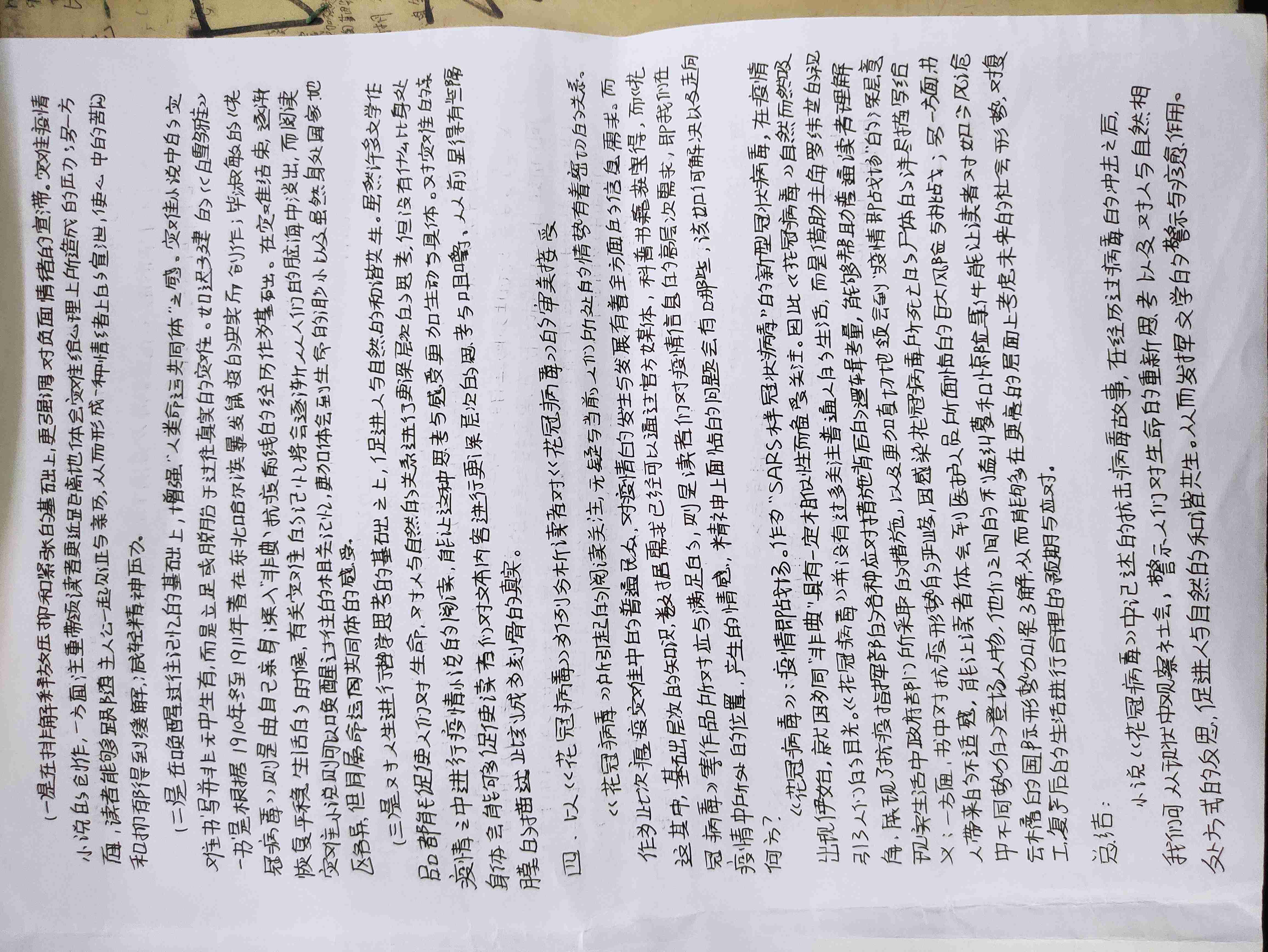 请同学们把期末考察作业即“关于疫情文学的评论”完成后,在微助教平台同时发送一份,(可以是拍照上传,也可以用讯飞手写字转word后进行电子版上传),辛苦大家啦,谢谢!