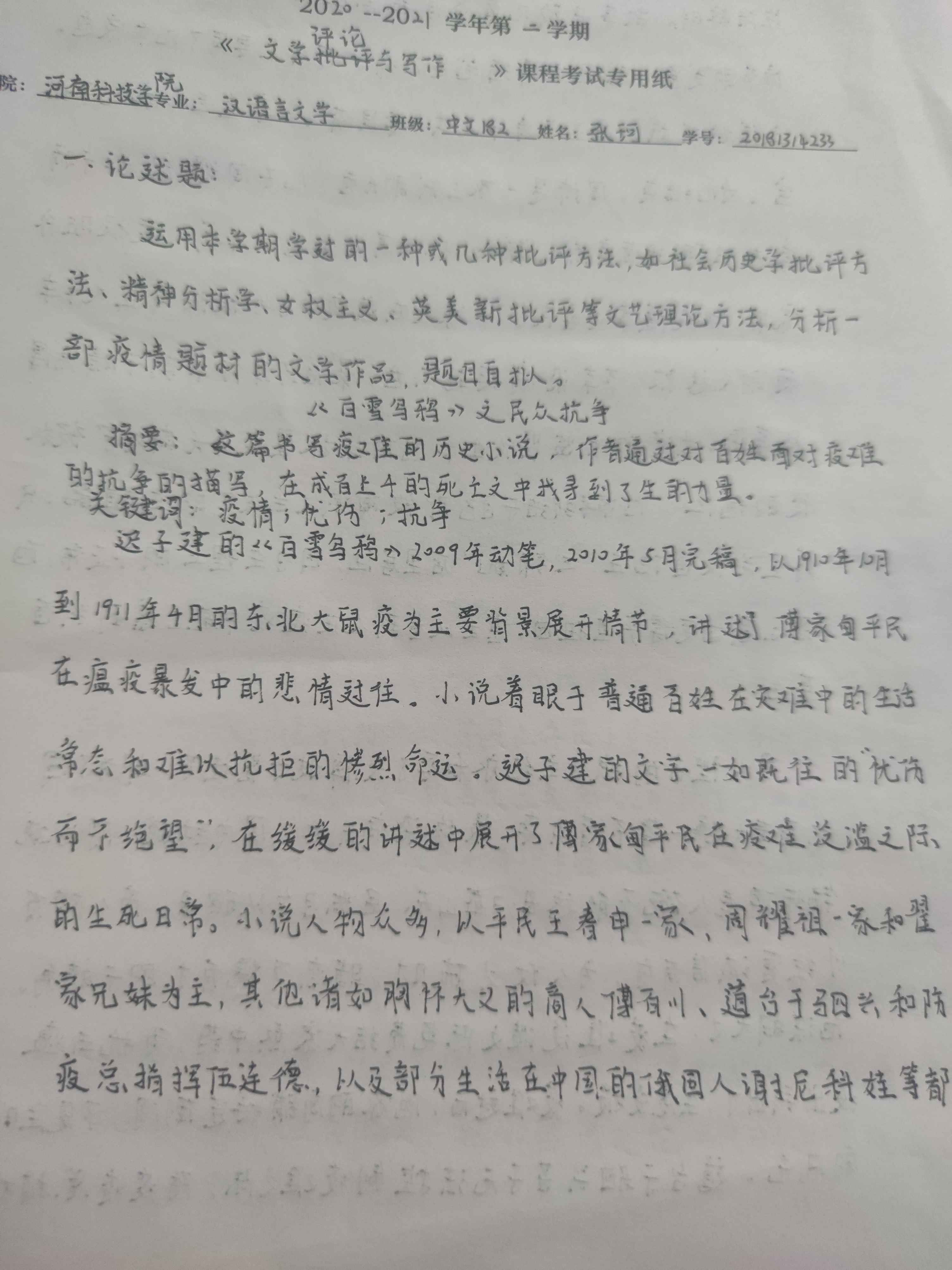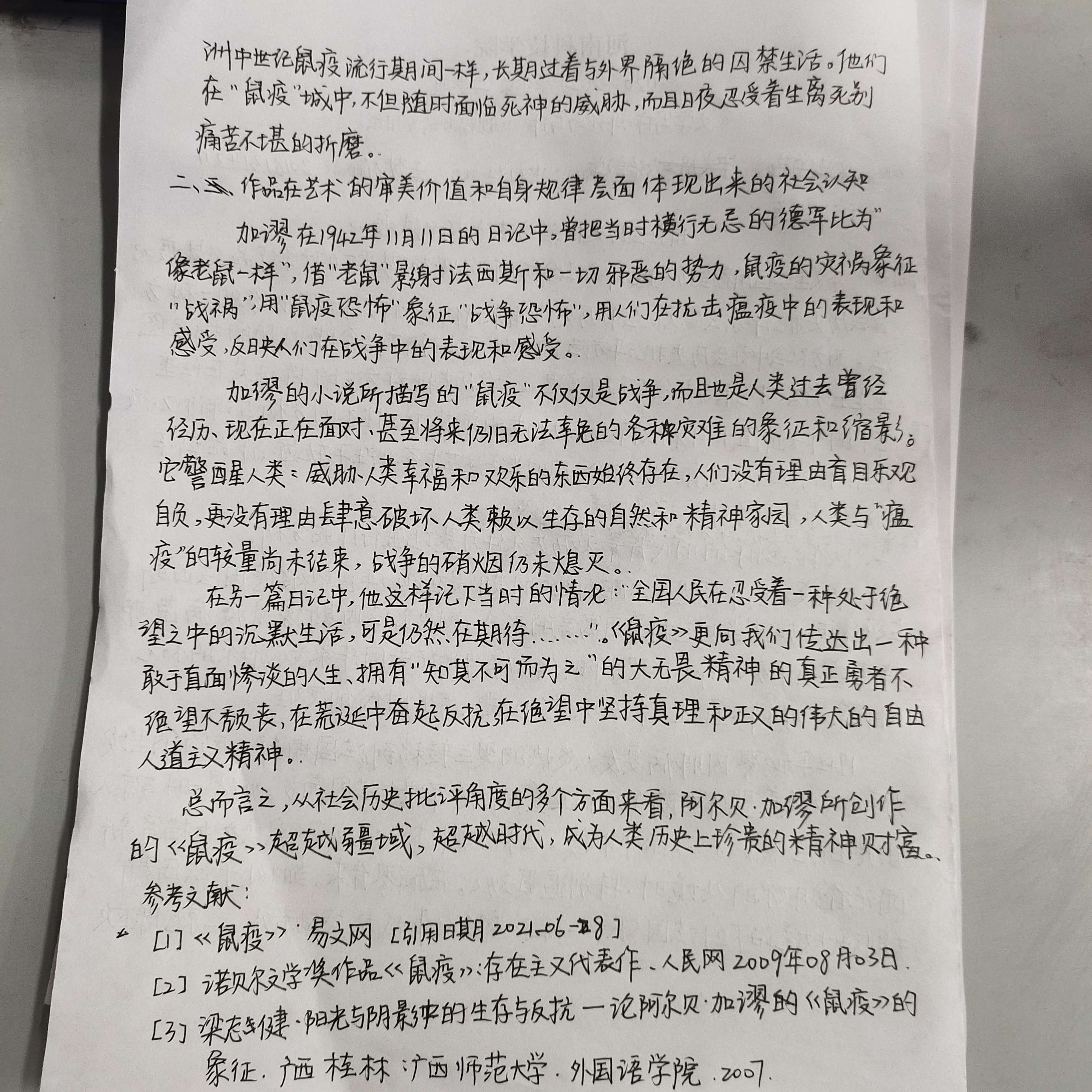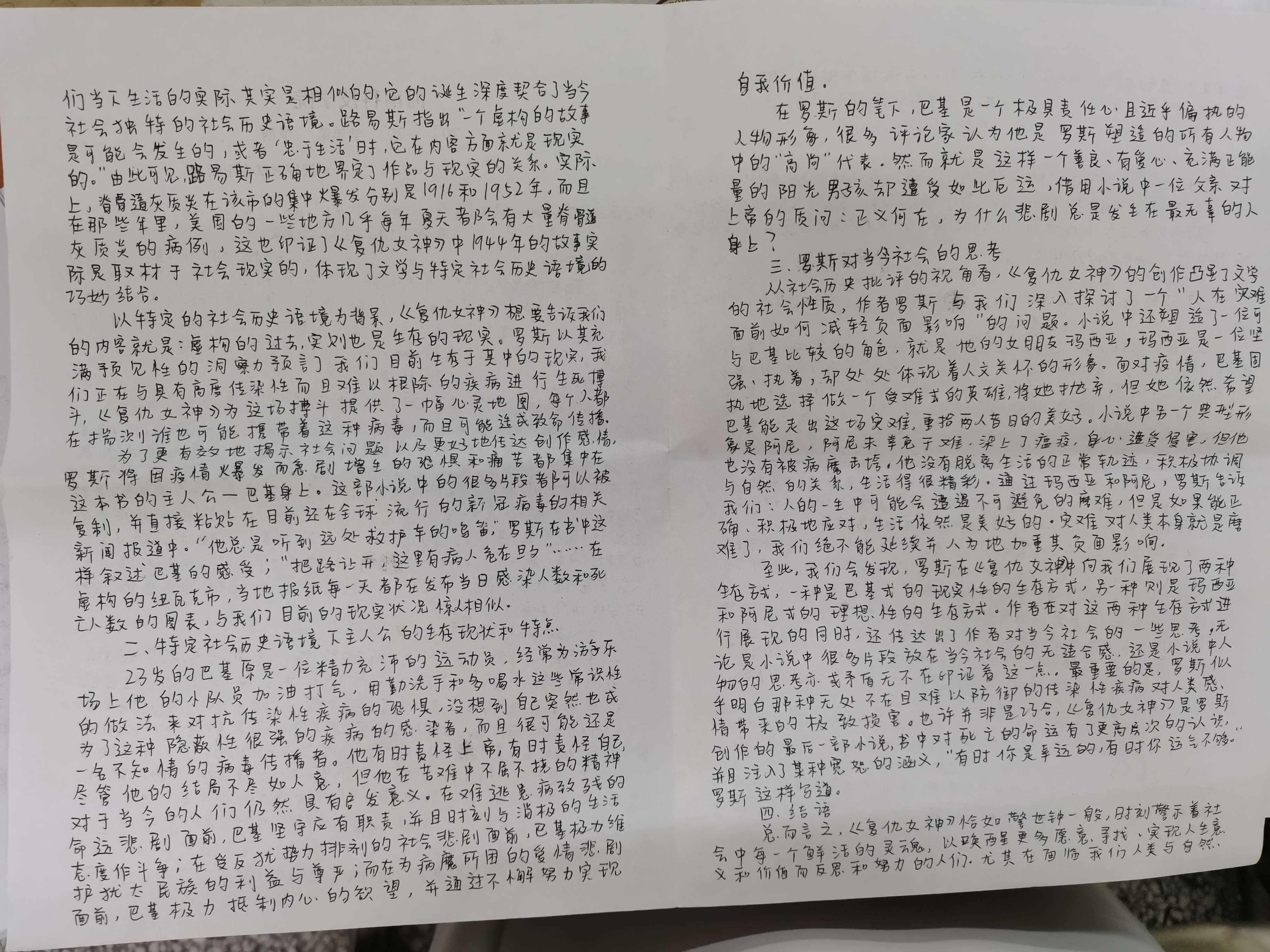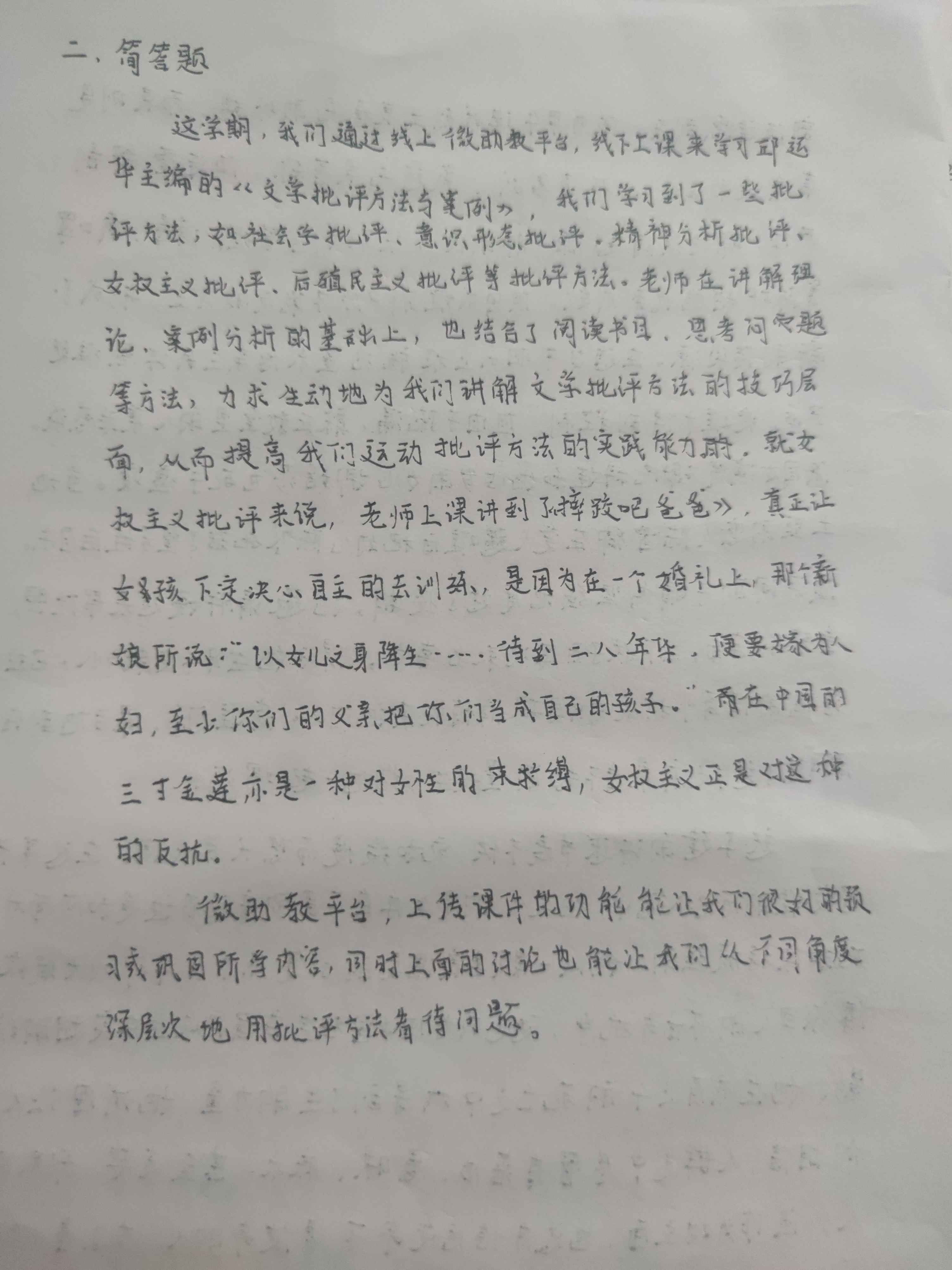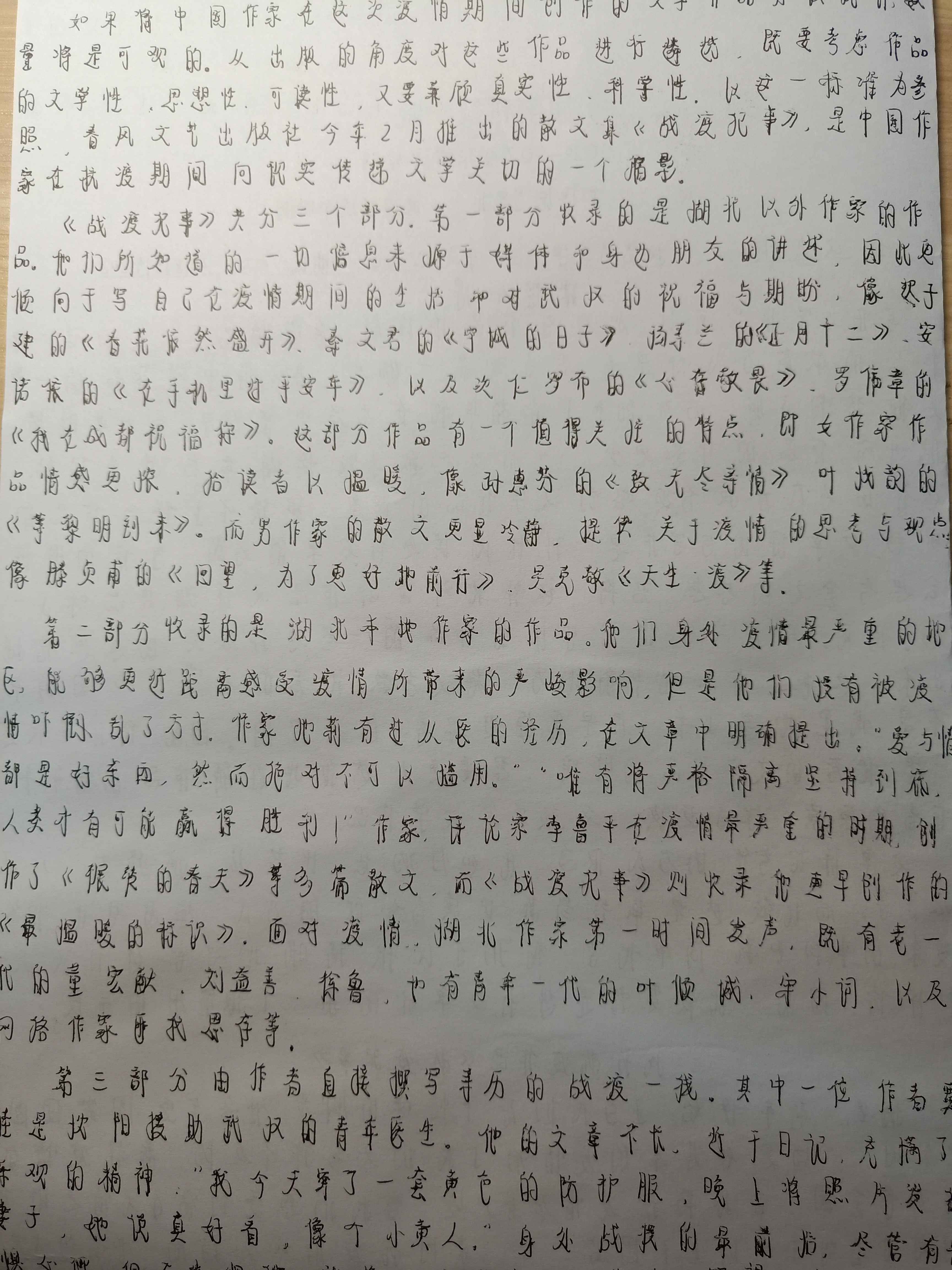 请同学们把期末考察作业即“关于疫情文学的评论”完成后,在微助教平台同时发送一份,(可以是拍照上传,也可以用讯飞手写字转word后进行电子版上传),辛苦大家啦,谢谢!