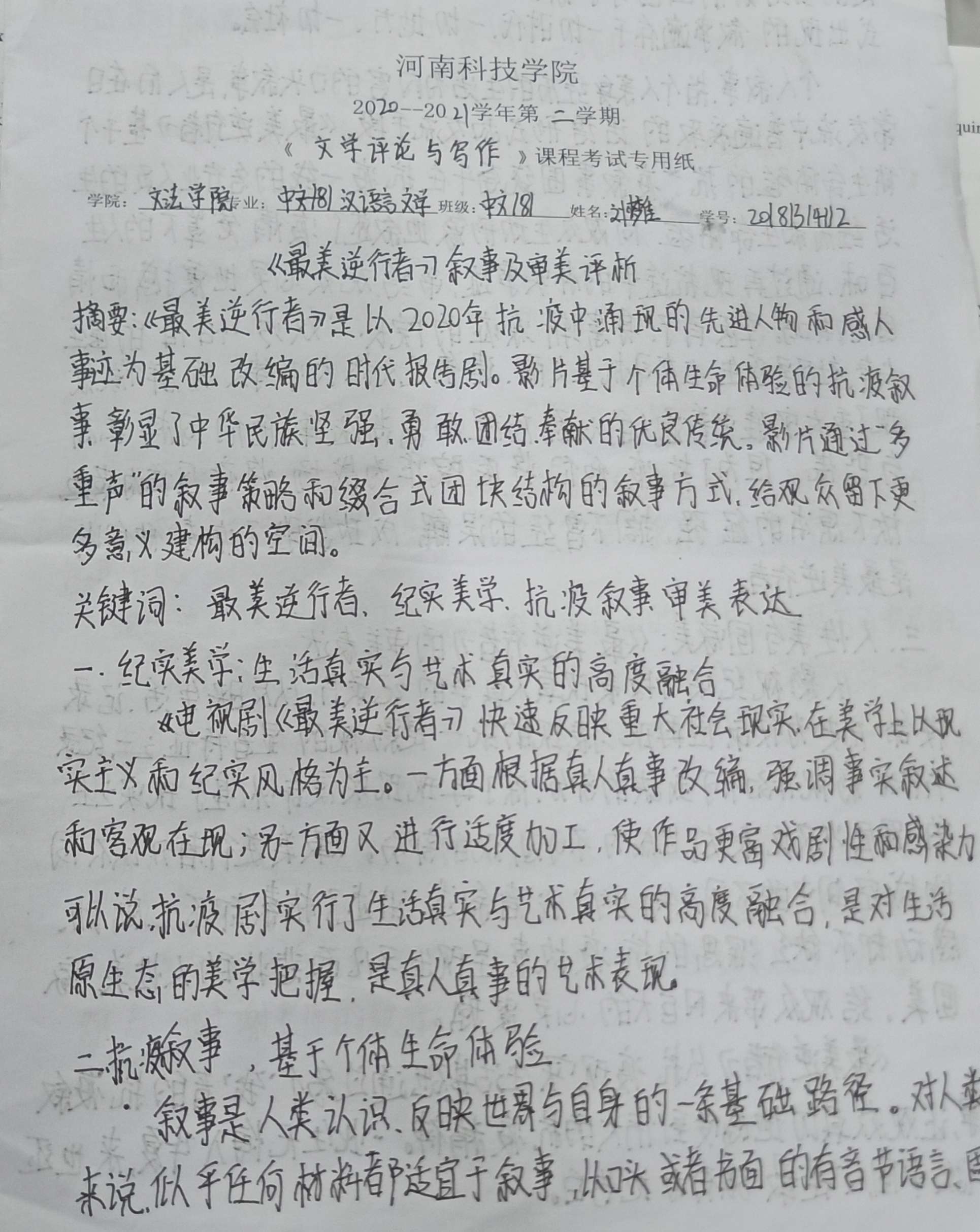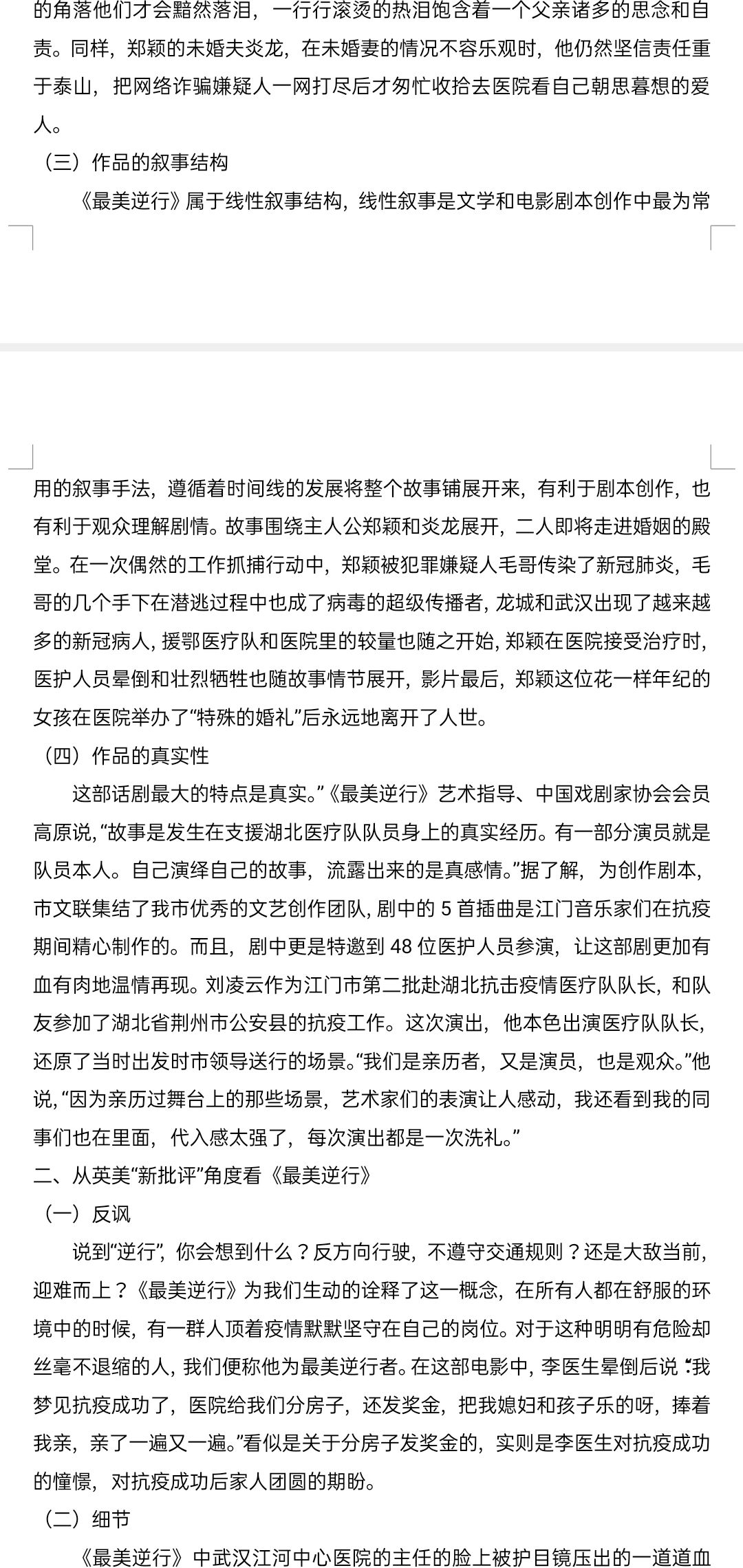 从社会学批评和英美新批评角度看《最美逆行》 摘要:电影《最美逆行》是一部优秀的文学作品,从社会学批评和英美“新批评”的角度去再次细琢这部作品,我们会收获不同的感受,更能进一步体会作品的“真善美”。 关键词:环境 道德 结构 真实性 文学语义 反讽和张力 2020年的春节,不同于往年走亲访友的热闹,家家户户大门紧闭,人人戴着口罩出行。一场突如其来的疫情防控狙击战,在中华大地骤然打响。这是一场没有硝烟的持久战,关系到每个人的生命健康。是的,疫情的肆虐令我们触动,但逆行者的面孔令我们感动。抗疫成功后,出现了一大批赞扬逆行者的影视和文学作品。电影《最美逆行》是一部反映广东援鄂医务人员和广州武汉高铁乘警们在本次疫情中坚难困苦,努力奋斗,可歌可泣的英雄故事。 一、从社会学批评角度看《最美逆行》 (一)作品的出现环境 正所谓艺术模仿环境。电影《最美逆行》的出现也是在中国抗击新冠疫情成功之后涌现出来的一大批优秀影视作品之一,社会环境的变化影响着文学的写作。发生在民间的抗疫故事,被改编为电影之后就不仅仅是只客观复述抗疫故事,同时这里面也传达出了中国人民团结一心,众志成城的血性和品质。 (二)作品的道德内涵 文学作为现实的阐释而具有影响社会的巨大功能,文学必然是道德的,必然是“真善美”的。在《最美逆行》中,郑颖的父亲郑祥福以及江甜的父亲吴主任,即使他们都失去了自己最亲最爱的女儿,他们依然坚守在抗疫前线,履行着医者父母心的承诺,在外人面前他们有过硬的心理素质和专业的医疗本领,在看不见的角落他们才会黯然落泪,一行行滚烫的热泪饱含着一个父亲诸多的思念和自责。同样,郑颖的未婚夫炎龙,在未婚妻的情况不容乐观时,他仍然坚信责任重于泰山,把网络诈骗嫌疑人一网打尽后才匆忙收拾去医院看自己朝思暮想的爱人。 (三)作品的叙事结构 《最美逆行》属于线性叙事结构,线性叙事是文学和电影剧本创作中最为常用的叙事手法,遵循着时间线的发展将整个故事铺展开来,有利于剧本创作,也有利于观众理解剧情。故事围绕主人公郑颖和炎龙展开,二人即将走进婚姻的殿堂。在一次偶然的工作抓捕行动中,郑颖被犯罪嫌疑人毛哥传染了新冠肺炎,毛哥的几个手下在潜逃过程中也成了病毒的超级传播者,龙城和武汉出现了越来越多的新冠病人,援鄂医疗队和医院里的较量也随之开始,郑颖在医院接受治疗时,医护人员晕倒和壮烈牺牲也随故事情节展开,影片最后,郑颖这位花一样年纪的女孩在医院举办了“特殊的婚礼”后永远地离开了人世。 (四)作品的真实性 这部话剧最大的特点是真实。”《最美逆行》艺术指导、中国戏剧家协会会员高原说,“故事是发生在支援湖北医疗队队员身上的真实经历。有一部分演员就是队员本人。自己演绎自己的故事,流露出来的是真感情。”据了解,为创作剧本,市文联集结了我市优秀的文艺创作团队,剧中的5首插曲是江门音乐家们在抗疫期间精心制作的。而且,剧中更是特邀到48位医护人员参演,让这部剧更加有血有肉地温情再现。刘凌云作为江门市第二批赴湖北抗击疫情医疗队队长,和队友参加了湖北省荆州市公安县的抗疫工作。这次演出,他本色出演医疗队队长,还原了当时出发时市领导送行的场景。“我们是亲历者,又是演员,也是观众。”他说,“因为亲历过舞台上的那些场景,艺术家们的表演让人感动,我还看到我的同事们也在里面,代入感太强了,每次演出都是一次洗礼。” 二、从英美“新批评”角度看《最美逆行》 (一)反讽 说到“逆行”,你会想到什么?反方向行驶,不遵守交通规则?还是大敌当前,迎难而上?《最美逆行》为我们生动的诠释了这一概念,在所有人都在舒服的环境中的时候,有一群人顶着疫情默默坚守在自己的岗位。对于这种明明有危险却丝毫不退缩的人,我们便称他为最美逆行者。在这部电影中,李医生晕倒后说:“我梦见抗疫成功了,医院给我们分房子,还发奖金,把我媳妇和孩子乐的呀,捧着我亲,亲了一遍又一遍。”看似是关于分房子发奖金的,实则是李医生对抗疫成功的憧憬,对抗疫成功后家人团圆的期盼。 (二)细节 《最美逆行》中武汉江河中心医院的主任的脸上被护目镜压出的一道道血痕,刘院长连续六天不回家坚守抗疫第一线,警察取消所有假期全员到岗,广东医疗队支援请战驰援武汉,吴主任和郑医生在失去女儿后稍作休息又随即投入下一位病人的手术当中,乐乐虽然平时嘴上不说不善表达但在江甜壮烈牺牲后追在救护车后面痛哭流涕。这些细节无疑不打动着我们每一个人,让我们在这些细节中体会到了最美逆行者的伟大。 (三)语境 同一句话放在不同的语境中会产生不同的含义,通过语境的营造产生相关的语义场,观众在这种语义场的渲染下投入感情产生共鸣。语义场提供了语境,语境也就决定了词语在这种情况下的意义是什么。“也许,你的武器只有手中一纸一笔。也许,你的战衣只有那薄薄一层。也许,你的工作只是统计分析汇总……但是,你一定要微笑着挺住,因为你就是人民心中的逆行英雄!”2020年除夕夜,来自河南省疾病预防控制中心的一封书信获医疗圈点赞。信的作者是河南省疾病预防控制中心办公室副主任苏佳。是的,在这种语境中,语言便有了“肌质”,有了内涵和情感,语言是力