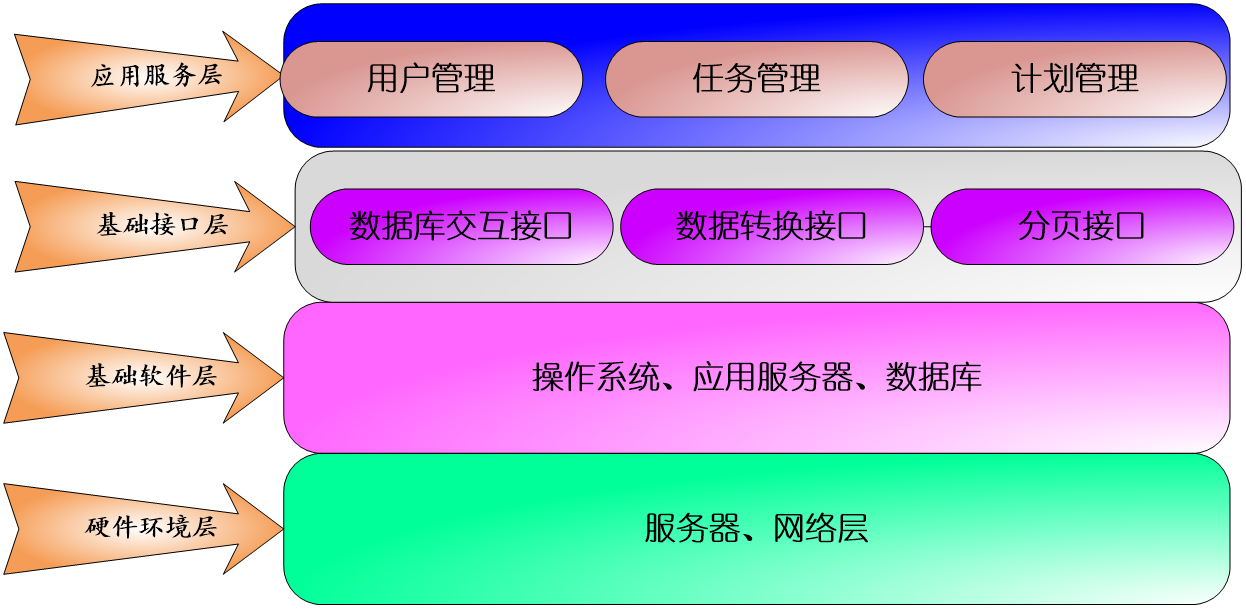任务管理系统在整体架构上,分为四个层次:应用服务层、基础接口层、基础软件层和硬件环境层。其具体结构图如下: