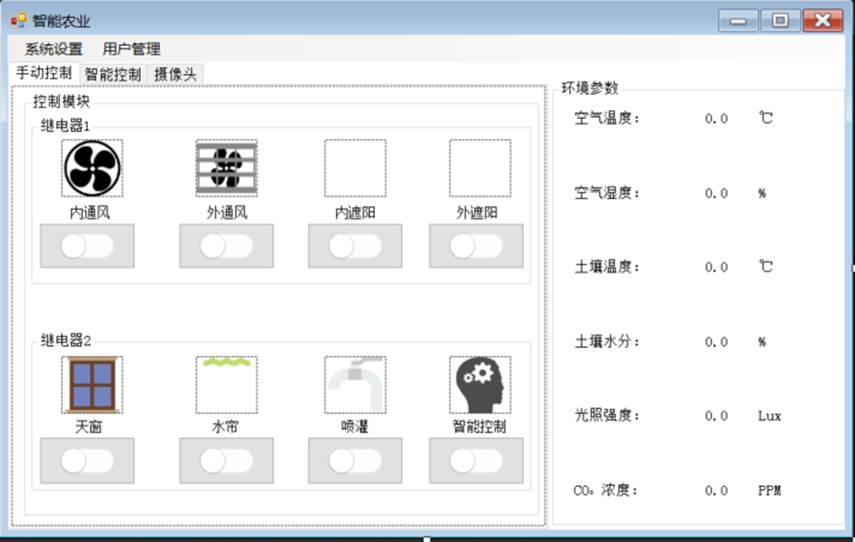 在上图中整个主界面分为五个部分,其中菜单栏提供功能菜单,手动控制来控制对应的设备,智能控制中设置相对应的阈值,摄像头来显示图像。环境参数用来显示环境数据