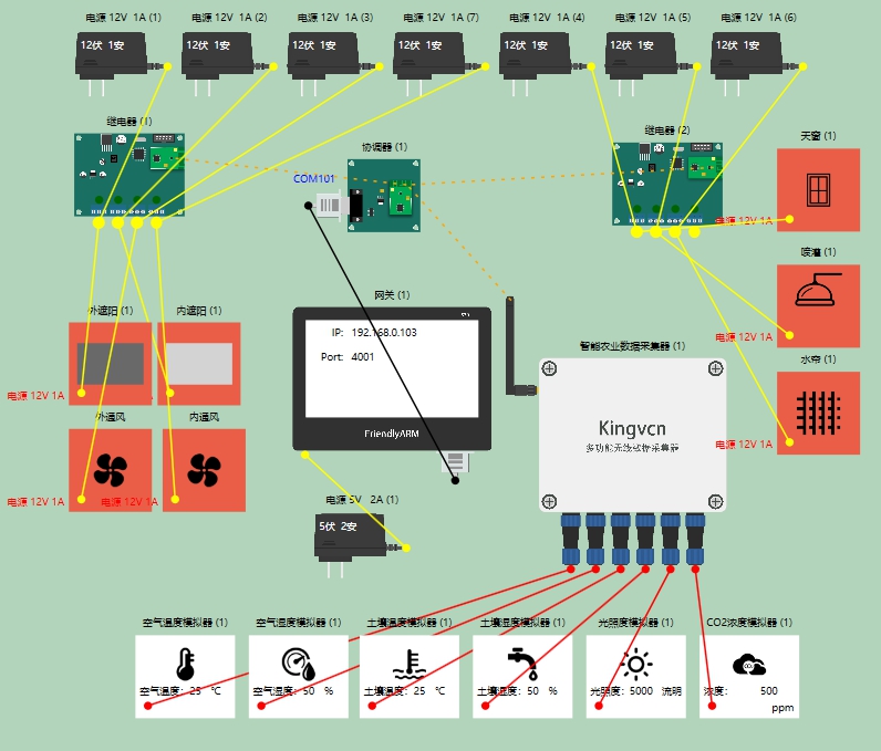 搭建硬件环境,如在《物联网虚拟仿真实验平台》中需拖入智能农业相关设备,如在《物联网实验台》中需连接智能农业硬件设备(具体如何连接这里不阐述)。(在预制模板中有智能农业模板,直接拖出来即可)
