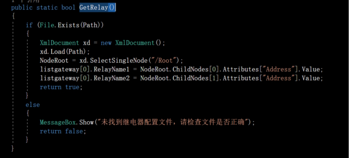 在ClassAll.cs类中有个GetRelay()静态方法,该方法作用是获取文件中的信息,并且进行返回。