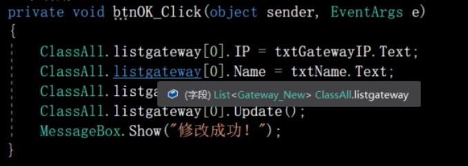 3) 在网关设置界面btnOK_Click事件中,将网关信息修改到数据库中。