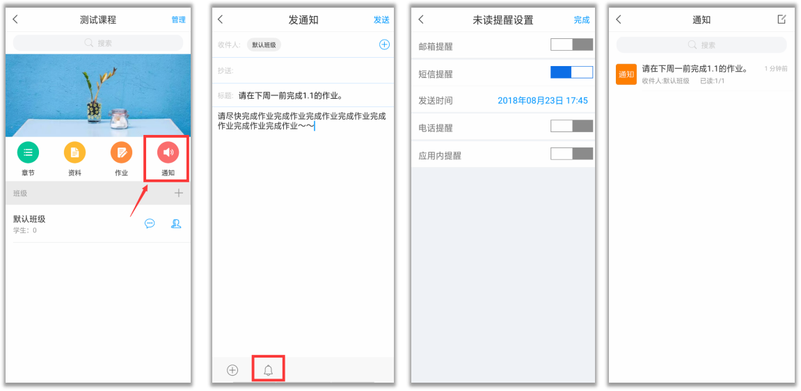 点击课程首页,选择“通知”,编辑好通知内容,选择通知的对象,根据需要设置未读提醒(邮箱、短信、电话、应用内提醒等),点击右上角“完成”按钮即可。