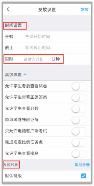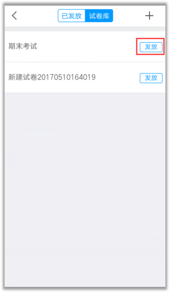 在试卷库找到创建好的试卷,点击“发布”,设置相关参数即可。