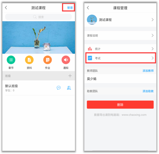 在电脑端编辑好的试卷,可以通过电脑端发布,也可以通过学习通发布。点击课程界面右上角“管理”按钮,进入考试。可以手动编辑,或者直接选择试卷库里的试卷进行发布。