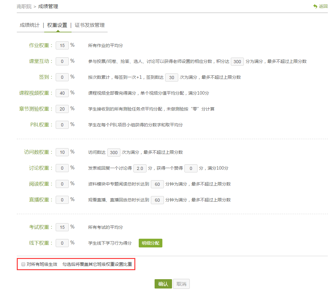 在“统计”,点击“成绩管理”,设置某一个班级该门课程的各项考核权重,也可勾选“对所有班级生效”。