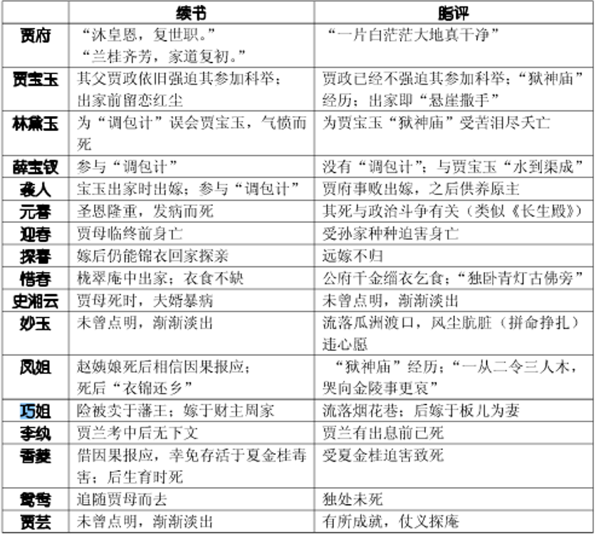 我们也还可以从第二点来讲,续书跟脂评里提出来的后面的一些情节,细细看起来是没有一条相合的。比如,第五回里面他就讲到了个人的命运,暗示了还有很多批语。但是真正细细研究来,没有一条相合的。而这些批语有些是在曹雪芹死了以后写的。可见曹雪芹的稿子跟后面续书是不相合的,并没有关系,并不是曹雪芹后来改了。