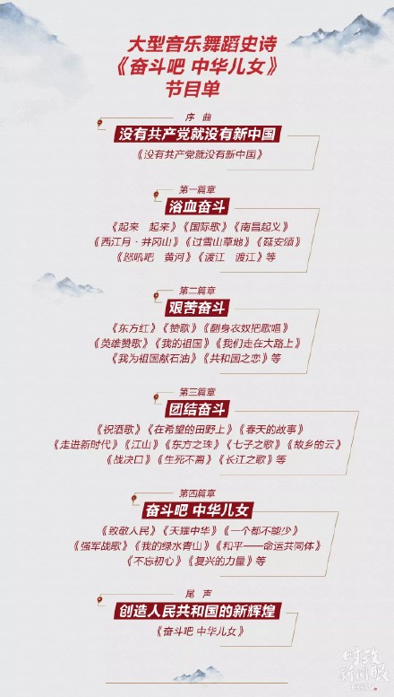 庆祝中华人民共和国成立70周年大型文艺晚会《奋斗吧 中华儿女》,共同回顾新中国成立70年来的辉煌历程,共同祝福伟大祖国的美好前程。整台晚会采用了近些年不多见的编年史诗结构,主要用音乐的元素表达。