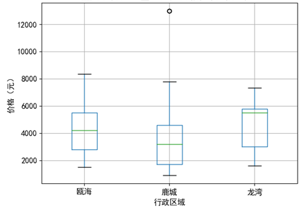 箱形图具有较强的数据分布检查和异常值检查功能。从温州市各行政区租赁价格的箱型图(图4.3)可以看出,鹿城存在上侧异常值。易得出,箱形图具有以下作用: