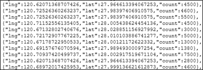 var points =[{"lng":120.65029680539033,"lat":28.017170429729519,"count":800}, {"lng":120.65675472819095,"lat":28.003560697418448,"count":550}, {"lng":120.69157588750697,"lat":27.989555139505119,"count":1280},]
