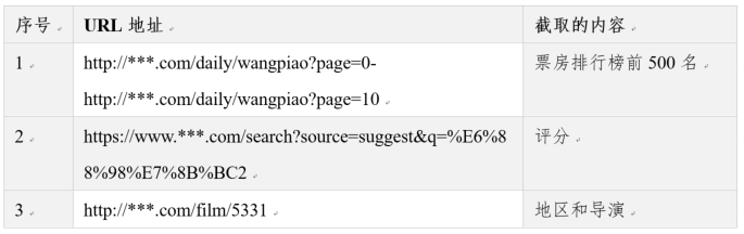 获得互联网上的信息还要确定采集数据的来源,即URL。通过查找,计划从以下网址中获取想要的数据。URL管理器中的网址列表如下表所示。