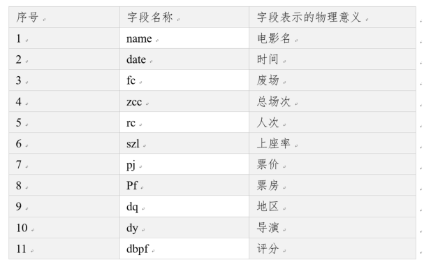 互联网数据各式各样,每个网站都会有更新每日上映的电影和票房数据。从网络上,我们可以获取很多的信息,为方便分析,设定从网络中获取以下如下表所示的数据项,包括电影名、导演等11项信息。