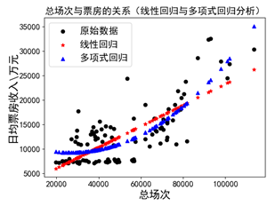 总场次与票房间存在一定的关系,用回归的方法对两者的相关性进行分析,结果如下图所示。图中,包括两种回归分析的方法,一种是线性回归,分析结果为直线,一种是多项式回归。当然一种因素不可能完全决定票房,它还很可能跟其它因素相关,比如:导演、所在地区、影片类型、演员。在分析时,可以获取更多数据,进行多元分析让结果更准确。