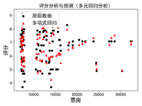 观众对电影的喜好程度可能体现在多个因素上,比如:电影票房、总场次、废场等,本小节就多元回归分析对评分做简单预测。结果如下图所示,其中只显示了票房的因素,实质上分析时,使用的是多元信息,包括票价、票房、总场次、废场次。相比之下,预测值与原始值比较接近。在实践中,可以对结果做一个评估,判定出偏差是多少。