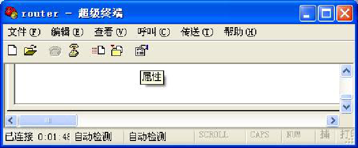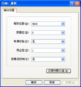 (4)设置串口(COM1)的属性:端口设置部分包含:每秒位数、数据位、奇偶校验、停止位、数据流控制。通常路由器/交换机通过console口访问需要把每秒数据位设置为“9600”,数据流控制设置为“无”。或者直接单击“还原为默认值”按钮进行自动设置。点击“确定”,即可进入如图所示的“超级终端”对话框。