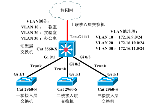 本项目中,汇聚层交换机选用的是具有三层路由功能的WS-C3560X-24T-L,下面通过三层交换机的SVI(交换机虚拟子接口)方式实现不同办公室、实验室、教室三个VLAN之间的通信。