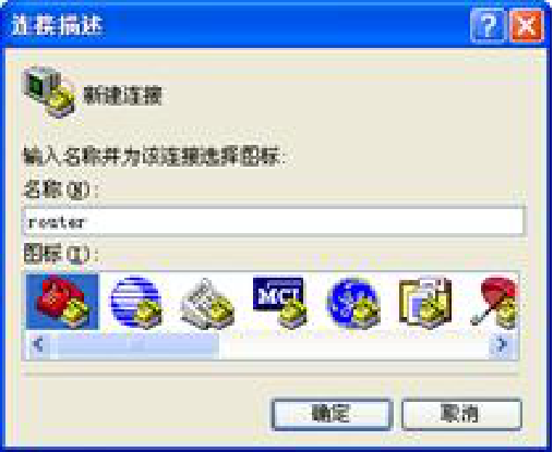 (2)连接命名:首次启动超级终端,出现如图所示的对话框,在“名称“下面的输入框中输入一个新建连接的名称(比如“router”),在“图标”下面的列表框中选择一个图标,单击“确定”按钮。