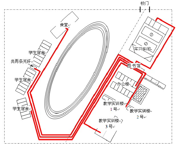 说明:教学实训楼2、办公楼已经布线,故此时不需布线。图书馆需在部分楼层布线,学生宿舍楼、实习车间、食堂都需要布线。