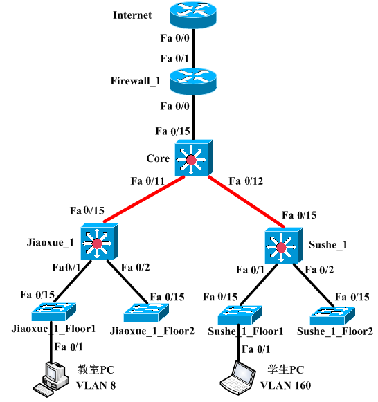 Core | 老校区核心交换机 | FastEthernet 0/11 | 172.16.0.1/30 | Jiaoxue_1 | FastEthernet 0/15 |