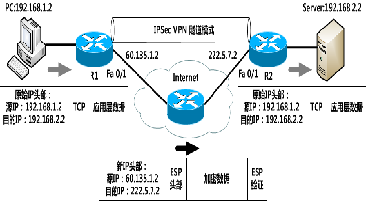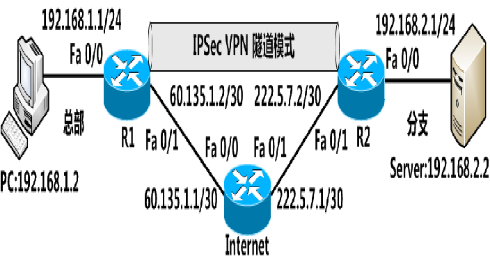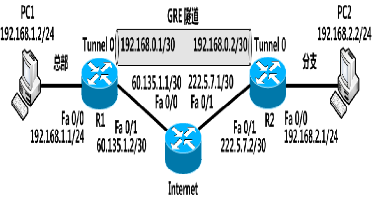 要使GRE VPN正常运作,前提是公网必须联通。路由器R1和R2的Fa0/1接口都连接到Internet,服务提供商必须保证路由器R1和R2能够各自访问到对方的Fa 0/1接口所配置的公网IP地址。