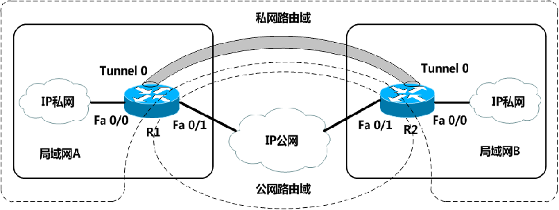 在隧道接口上需要指定隧道的实际物理出接口(或隧道的源IP地址)和隧道的目的IP地址,隧道接口依赖物理接口进行实际的通信。在隧道接口上需要配置私有IP地址,因此隧道接口也属于私网路由域。通过隧道接口,用户的两个私网路由域就可以互通了。