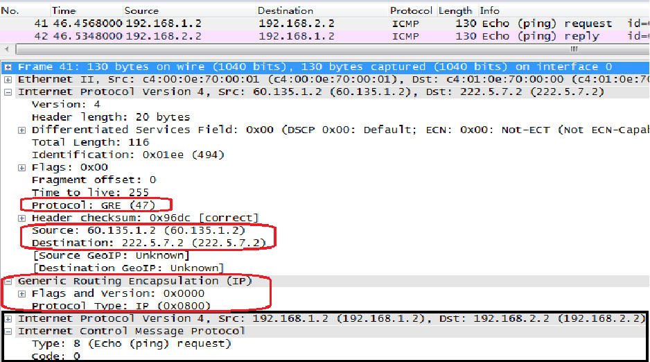GRE是一种三层隧道封装技术,其封装格式如图5-30所示。原始IP数据包包括IP头部、TCP(或UDP)头部和应用层数据,GRE协议将原始数据包封装在新数据包的内部。GRE在内层IP头部之间添加一个GRE头部,并在GRE头部之前再添加一个新的外层IP头部。经过GRE封装后的新的IP数据包前面添加数据链路层头部,并在链路上进行传输。被封装的内层IP数据包为载荷协议,GRE为封装协议,而封装后的新的外层IP头部为承载协议。GRE对载荷协议(内层IP数据包)不提供任何安全防护,在后面的GRE配置案例中,可以使用Wireshark数据包分析工具获取GRE传送的原始数据