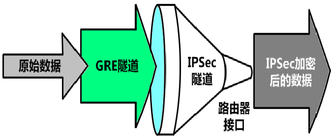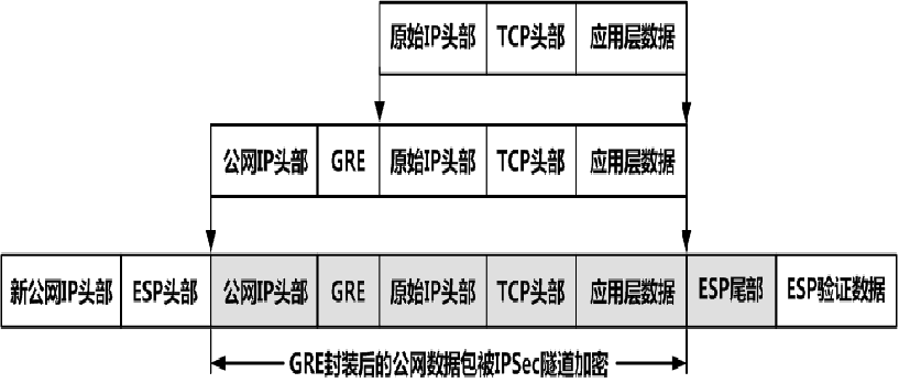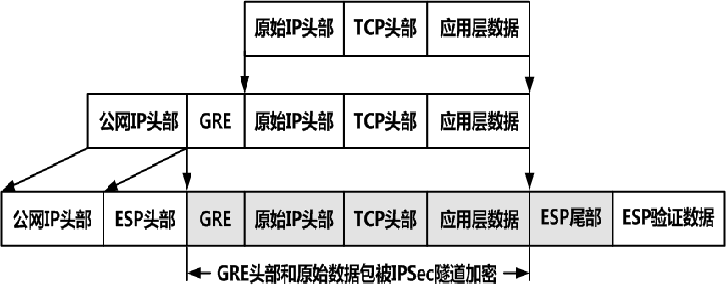 GRE本身是一种封装方法,而不是指VPN。GRE是由Cisco公司开发的轻量级隧道协议,能够在任意一种网络协议上传送任意另一种网络协议的封装方法。将GRE称作轻量级隧道协议的原因是GRE的头部较小,封装效率高,但是GRE没有任何安全防护机制,因此在5.4.4节会介绍GRE over IPSec VPN,使用IPSec保护GRE隧道。
