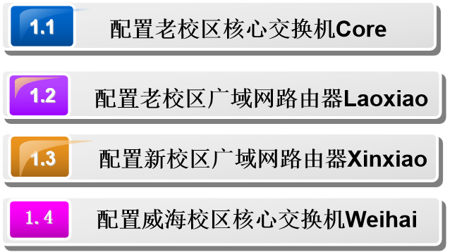 本工作任务的目标是综合运用多种VPN技术,将Leader职业学院的老校区与威海校区、老校区与青岛校区通过广域网互联起来。